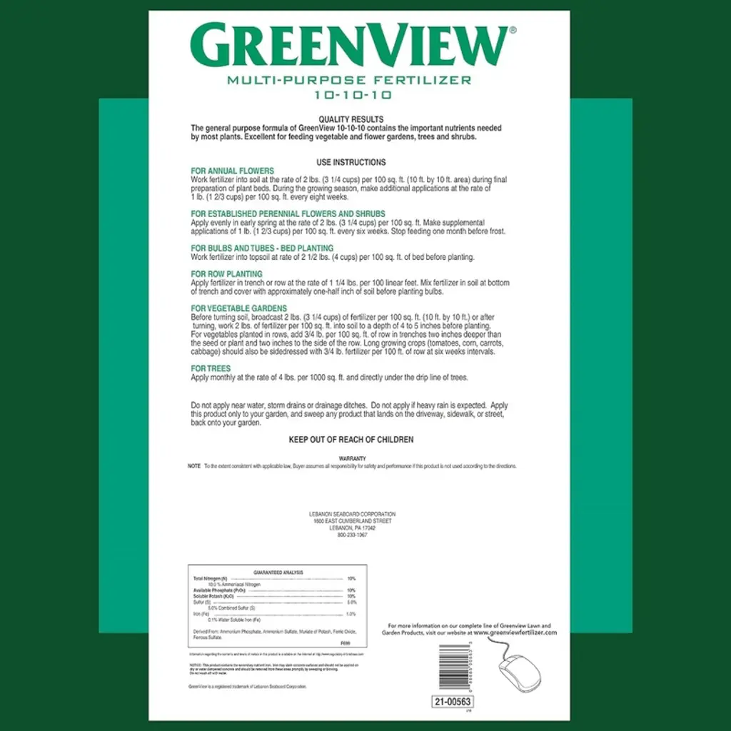 GreenView Multi-Purpose Fertilizer 10-10-10 is the perfect all-around solution for promoting healthy, vibrant plants throughout your garden, lawn, and landscape. With its balanced formula of equal nitrogen, phosphorus, and potassium, this fertilizer supports robust root growth, lush foliage, and strong flowering. Whether you're planting new seeds, transplanting, or maintaining your garden, this versatile fertilizer is ideal for flowers, vegetables, lawns, and more. Easy to apply and effective for all types of plants, GreenView ensures your garden flourishes with long-lasting health and beauty. Make your plants thrive with the perfect balance of nutrients for vibrant, healthy growth.