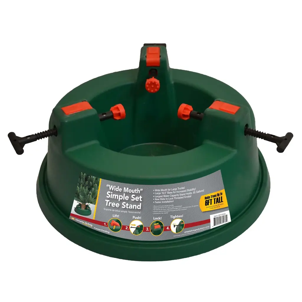 The wide-mouth simple set tree stand provides a quick and easy solution for setting up your live Christmas trees. This green stand keeps the water in its base, has no leaks, and features a trunk spike pad with a tower hole to secure your Christmas tree. Featuring the new slide-to-lock threaded knobs for faster installation it will outperform any other tree stand. This stand holds trees up to 6ft tall and accommodates up to 0.95 gallons of water to help keep trees fresh during the holiday season. Product Features: Green standard plastic live tree stand Easy slide lock system Largest water capacity stand holds 0.95 gallons Fits trees up to 6ft tall Dimensions: 7.5" high x 16.5" diameter Material(s): plastic