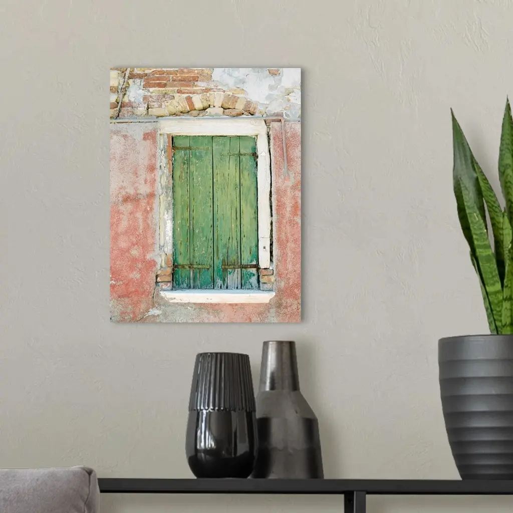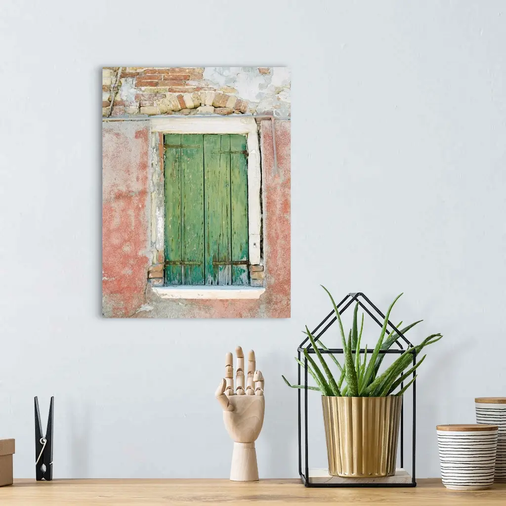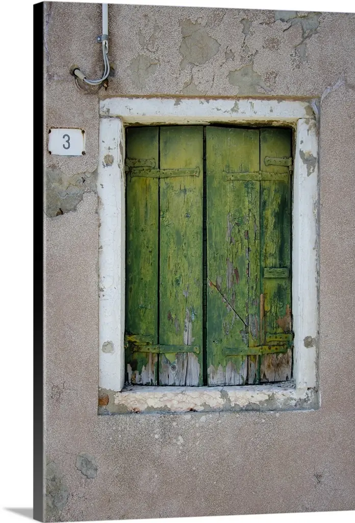 Photograph of a small window with ancient green shutters, Burano, Italy.