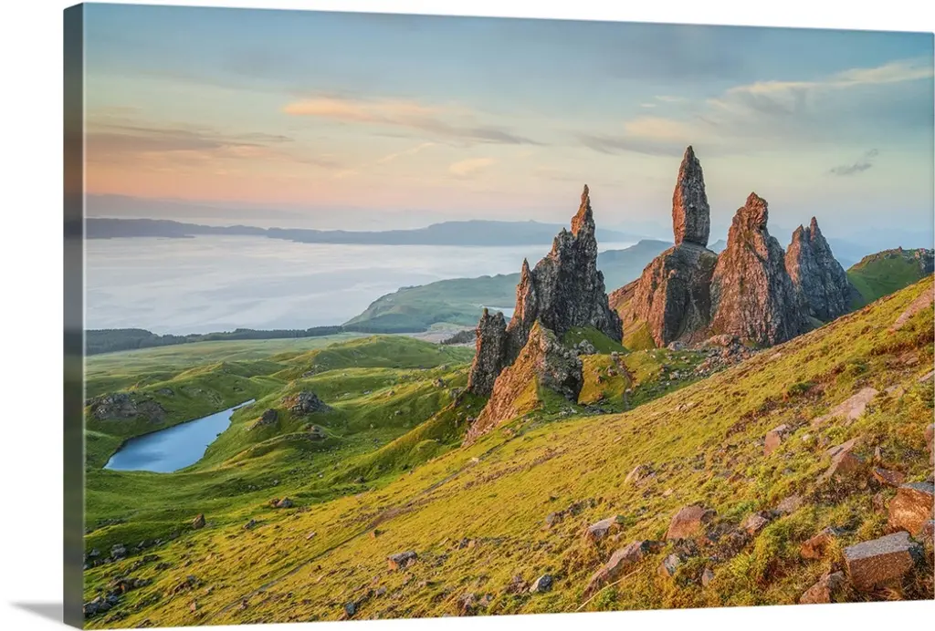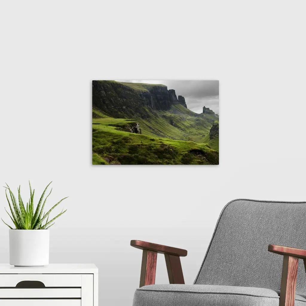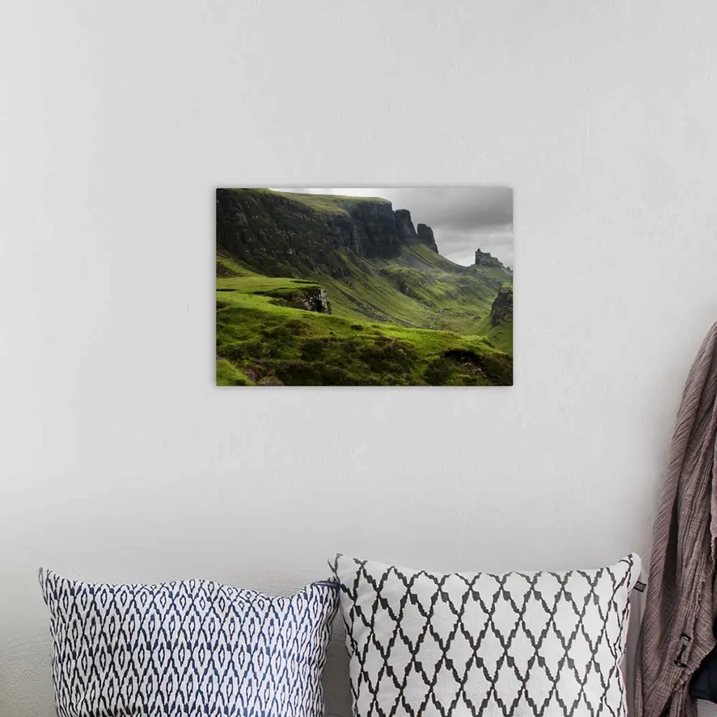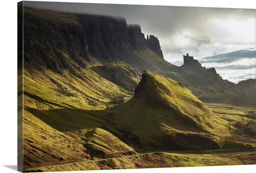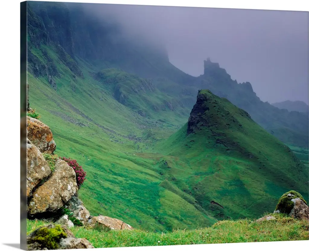Fine art photo of a misty valley surrounded by steep cliffs.