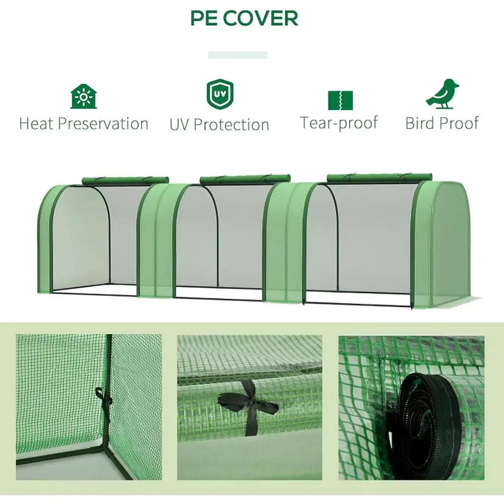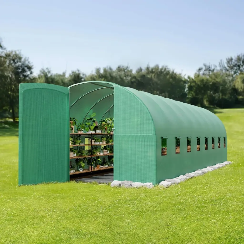Discover the ultimate solution for your gardening needs with our Heavy Duty Large Walk-In Greenhouse, designed for both outdoor and indoor use. Crafted with a reinforced iron frame and durable PE cover, this greenhouse offers exceptional strength and stability, ensuring your plants are protected from harsh weather conditions year-round. The spacious dome design provides ample room for your flowers, plants, and seedlings to thrive, making it perfect for both hobbyists and serious gardeners.Featuring a convenient roll-up door, you can easily access your plants while maintaining optimal ventilation to promote healthy growth. The triple-layered PE cover is UV resistant and waterproof, shielding your garden from excessive sunlight, rain, and wind. Its portable and compact design allows you to move and set up the greenhouse effortlessly, making it ideal for any garden, patio, or backyard.Whether you are growing flowers, vegetables, or herbs, this greenhouse creates a warm and controlled environment to extend your growing season and improve plant health. The sturdy iron frame ensures durability and long-lasting use, while the transparent cover lets in plenty of natural light.Key Features:- Heavy-duty reinforced iron frame for maximum stability and durability- Large walk-in design offers ample space for various plants and gardening activities- Triple-layer PE cover provides excellent protection against UV rays, rain, and wind- Roll-up door for easy access and ventilation control- Portable and easy to assemble, perfect for both indoor and outdoor use- Ideal for flowers, plants, seedlings, and small garden setupsUpgrade your gardening experience with this reliable, versatile greenhouse that supports healthy plant growth and protects your garden throughout the seasons. Perfect for anyone looking to cultivate a thriving garden with ease and confidence.
