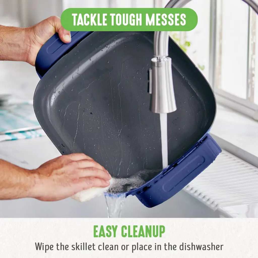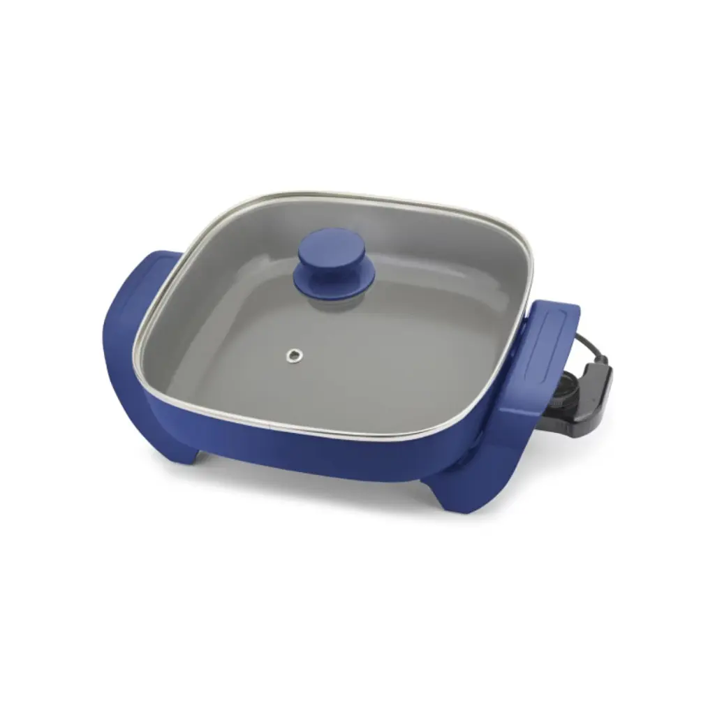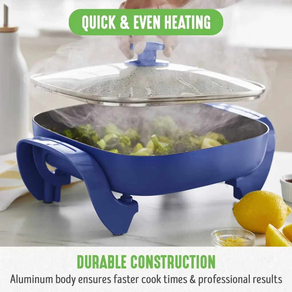 If you’re looking for an entire kitchen you can plug in, look no further. With the Healthy Power 5-in-1 Electric Skillet you can fry, sauté, bake, grill, steam, and more. Our healthy ceramic nonstick coating is specially designed for kitchen electrics to give you optimal nonstick performance. Plus, our coating is made without PFAS, PFOA, lead, and cadmium so you can cook every meal healthier. The 5QT capacity and 12” x12” surface area gives you ample room to for large portions the whole family can enjoy – from large batches of pancakes and eggs in the morning to delicious lasagnas and chicken cutlets at night. The one-knob control lets you dial in your desired temperature for perfect results, while the stay-cool handles and non-slip bottom keep you comfortable and in control. Plus, the tempered glass lid seals in heat, moisture, and flavor while you watch your meal’s progress. Simply wipe the skillet clean when you’re though or place it in the dishwasher for tough messes.