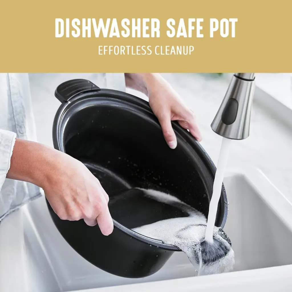 Save time when you go slow with the Healthy Cook Slow Cooker. This multipurpose slow cooker has an easy-to-use nonstick pot you can pop out for quick searing and sautéing, then just return it to the base to keep cooking low and slow. It’s the perfect way to infuse any meal with mouthwatering flavor. The extra deep 6QT pot features our healthy ceramic nonstick coating for effortless cleanup and fantastic performance. It’s also free of PFAS, PFOA, lead, and cadmium, so everything you make will be a little healthier. The easy-to-use control panel has five cooking functions to perfect your meal, whether you want to delay the start for a few hours or program the Healthy Cook Slow Cooker for up to 10 hours. Once your meal is finished, this slow cooker switches to the warm mode to keep your food ready for up to 4 hours. The lid and pot are dishwasher safe to make cleanup easy.