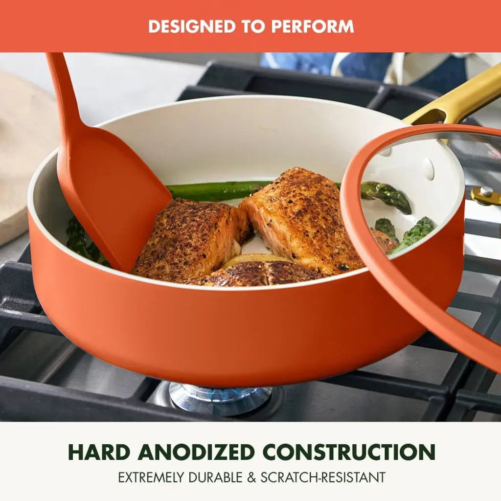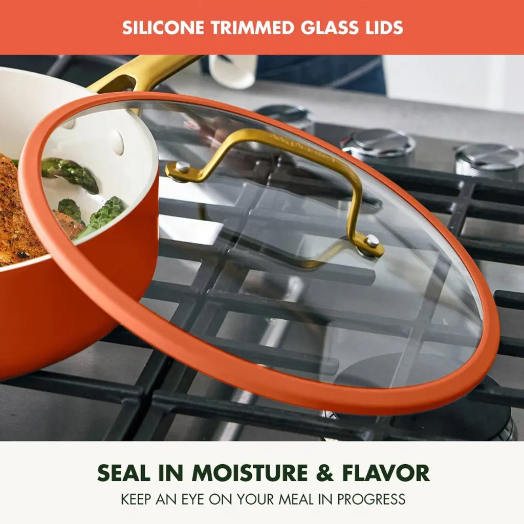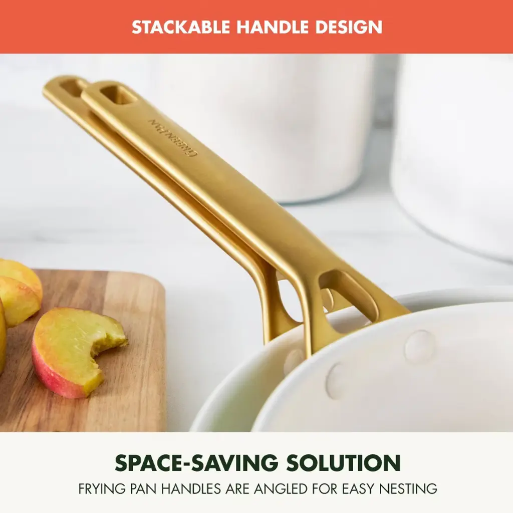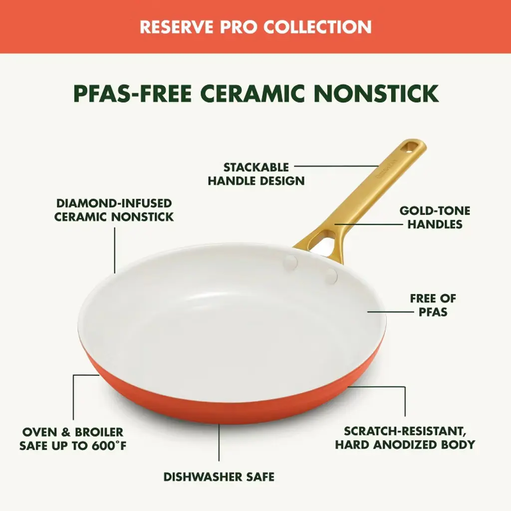 GreenPan has reimagined their bestselling Reserve collection with subtle architectural details and a sophisticated edge—introducing Reserve Pro, where form meets groundbreaking function. Inspired by neoclassical design, this collection makes a stunning contemporary statement in any kitchen. At the core is Thermolon™ 9G, GreenPan’s most advanced ceramic nonstick coating yet. Infused with diamonds for incredible durability and responsiveness, it’s metal utensil safe, free of PFAS, and crafted for confident cooking morning to night. The duoforged hard anodized aluminum body offers lasting strength and even heat distribution, while gold-tone stainless steel handles add a refined touch and a secure, comfortable grip. Finished with durable glass lids featuring a silicone rim to seal in heat and flavor, this collection is oven safe up to 600˚F (lids to 392˚F) and dishwasher safe for effortless cleanup.