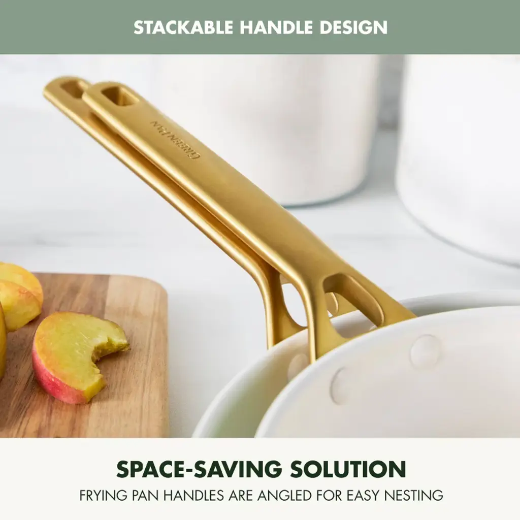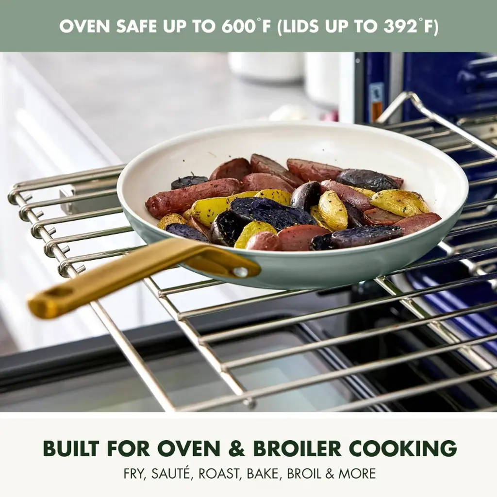 GreenPan has reimagined their bestselling Reserve collection with subtle architectural details and a sophisticated edge—introducing Reserve Pro, where form meets groundbreaking function. Inspired by neoclassical design, this collection makes a stunning contemporary statement in any kitchen. At the core is Thermolon™ 9G, GreenPan’s most advanced ceramic nonstick coating yet. Infused with diamonds for incredible durability and responsiveness, it’s metal utensil safe, free of PFAS, and crafted for confident cooking morning to night. The duoforged hard anodized aluminum body offers lasting strength and even heat distribution, while gold-tone stainless steel handles add a refined touch and a secure, comfortable grip. Finished with durable glass lids featuring a silicone rim to seal in heat and flavor, this collection is oven safe up to 600˚F (lids to 392˚F) and dishwasher safe for effortless cleanup.