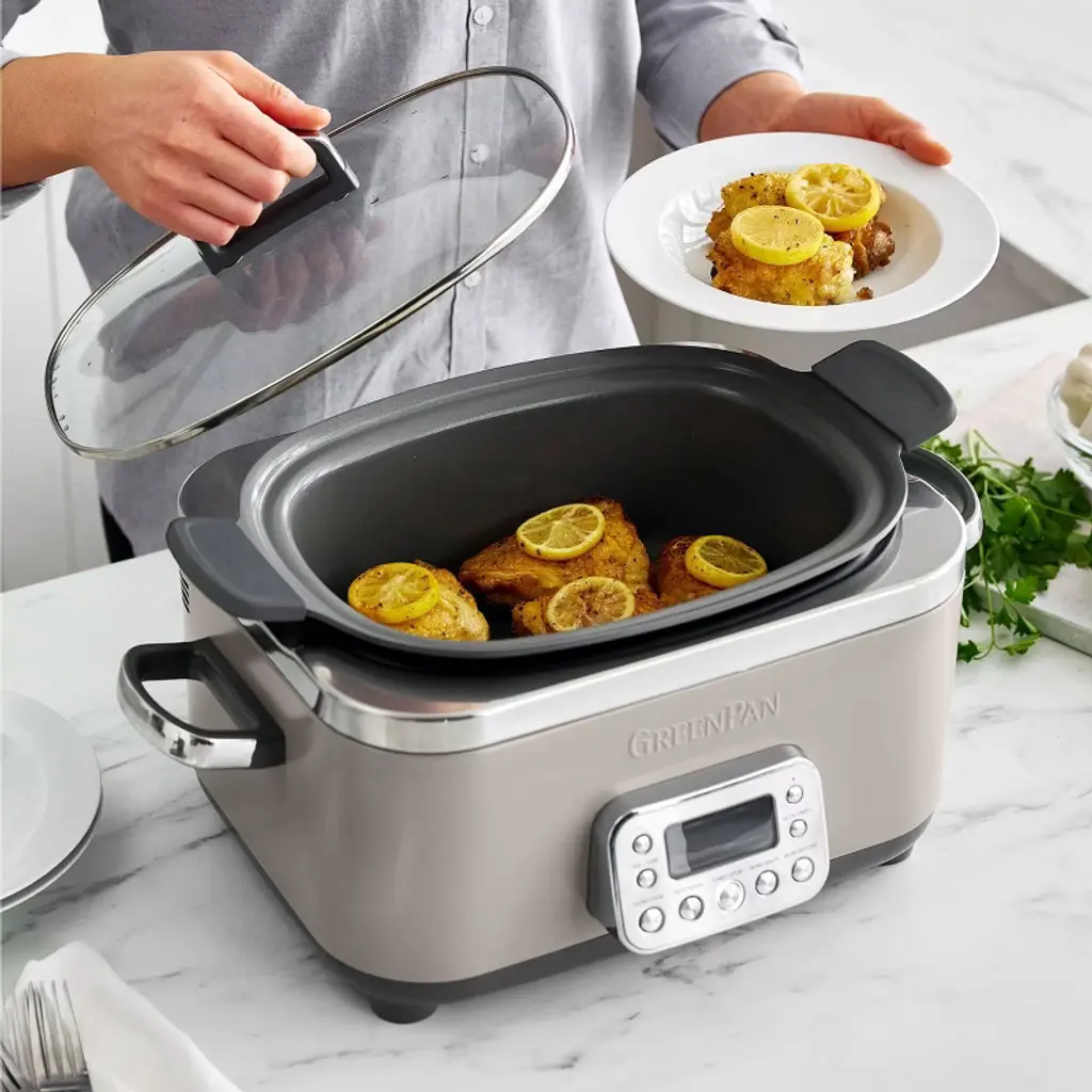 This bold refresh of GreenPan’s groundbreaking and bestselling slow cooker makes it more versatile than ever. Packed with 14 easy-to-use presets (including all-new stir-fry, rice, and bake settings), this do-it-all slow cooker delivers incredible flavor with the touch of a button. This cutting-edge design features Thermolon™ Volt, GreenPan’s most advanced ceramic nonstick ever, a PFAS-free nonstick that’s infused with diamonds to deliver incredible durability, effortless release, and powerful performance. It’s even metal utensil safe. This slow cooker makes it simple to brown ingredients right in the pot, then go low and slow to bring out rich, complex flavors. The redesigned controls are easier than ever and make choosing the right setting effortless, while the spacious 6-quart capacity gives you plenty of room for family-sized meals (and then some). The included stainless steel steamer makes it easy to master dumplings, shellfish, and fresh steamed vegetables, and the tempered glass lid locks in heat. The removable pot easily wipes clean and is even dishwasher safe. Add innovation to your next recipe with GreenPan.