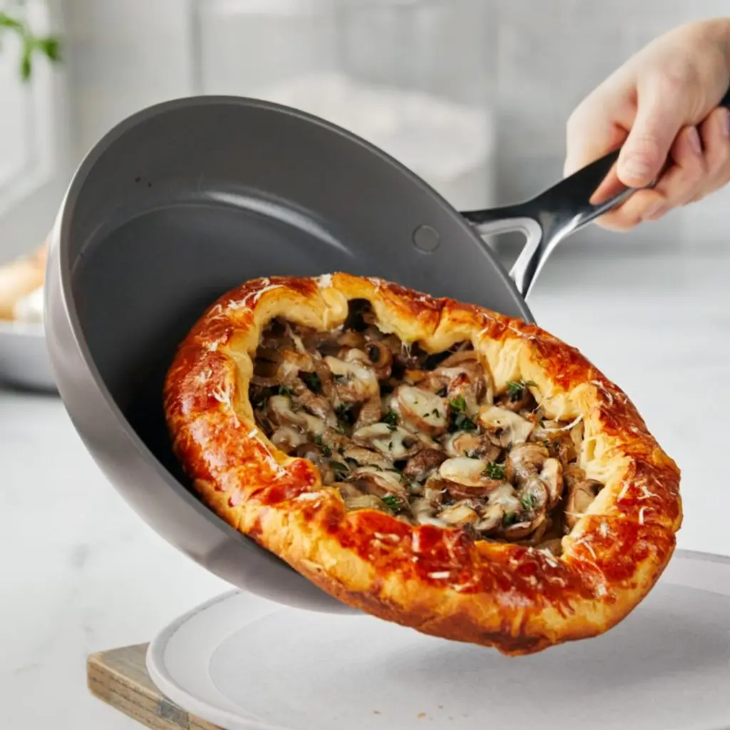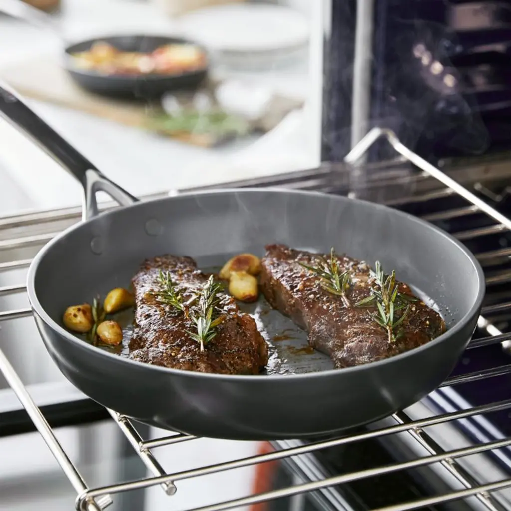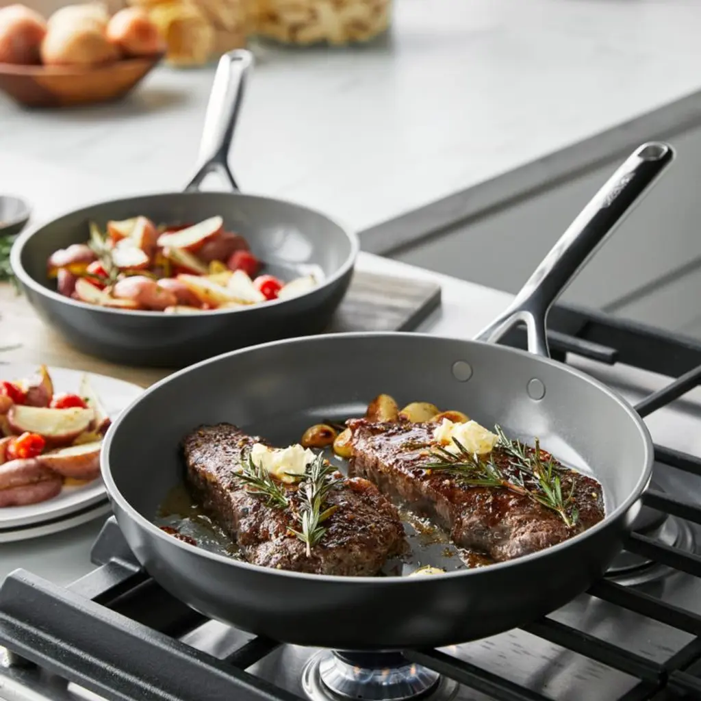 GreenPan's new advanced ceramic non-stick cookware represents 15 years of innovation. This versatile GP5 cookware set in rich cocoa brown fries, sears, simmers, stews, bakes and more. Infused with diamonds, the multilayer ceramic non-stick coating stands up to metal utensils, high heat, dishwashers and daily use. The heavy-gauge aluminum base heats evenly, flexing to keep the pans flat so cooking oils don't pool. Fitted with stainless steel handles that stay cool on the stovetop, the pans won't release harmful fumes even when overheated.