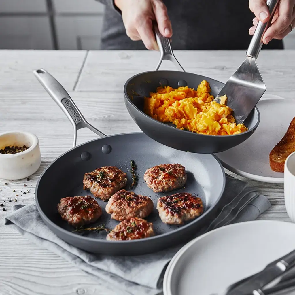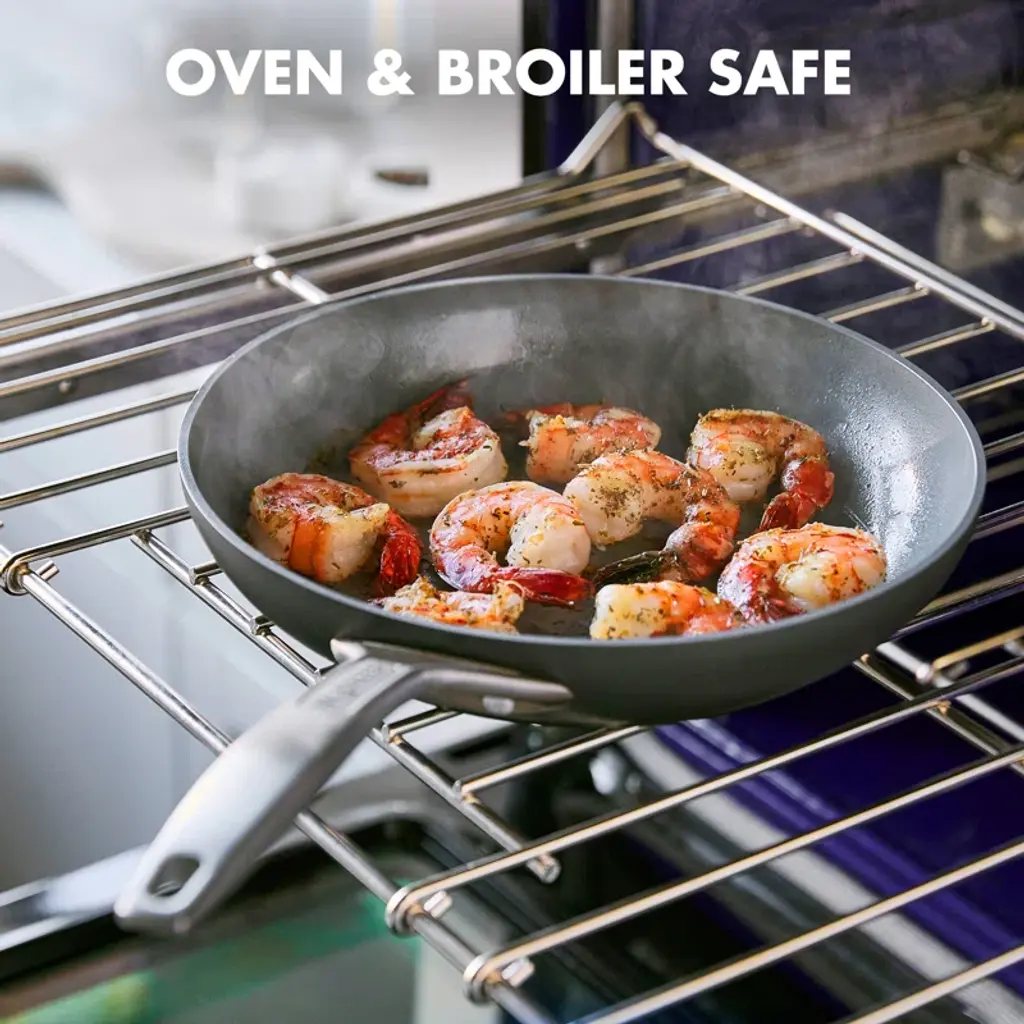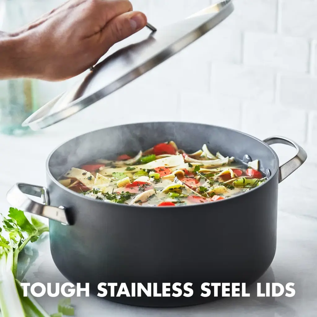 The GreenPan Paris Pro 11pc Ceramic Non-Stick Cookware Set is the perfect mix of class and convenience. Paris Pro is made of durable hard anodized aluminum for even heat conduction and is complete with a matte dishwasher-safe coating. The eye-catching, ergonomic stainless steel handle is riveted for a stronghold and the stainless steel lid is built to last, allowing for oven use. The interior is coated with Thermolon Minerals, now metal utensils safe and last even in the face of intense use and cleaning. Complete with a limited lifetime warranty for worry-free cooking. This set includes an 8” open frypan, 9.5” open frypan, 11” covered saucepan, 3qt covered saucepans, 3qt covered saute pan, and 5.5qt covered casserole.