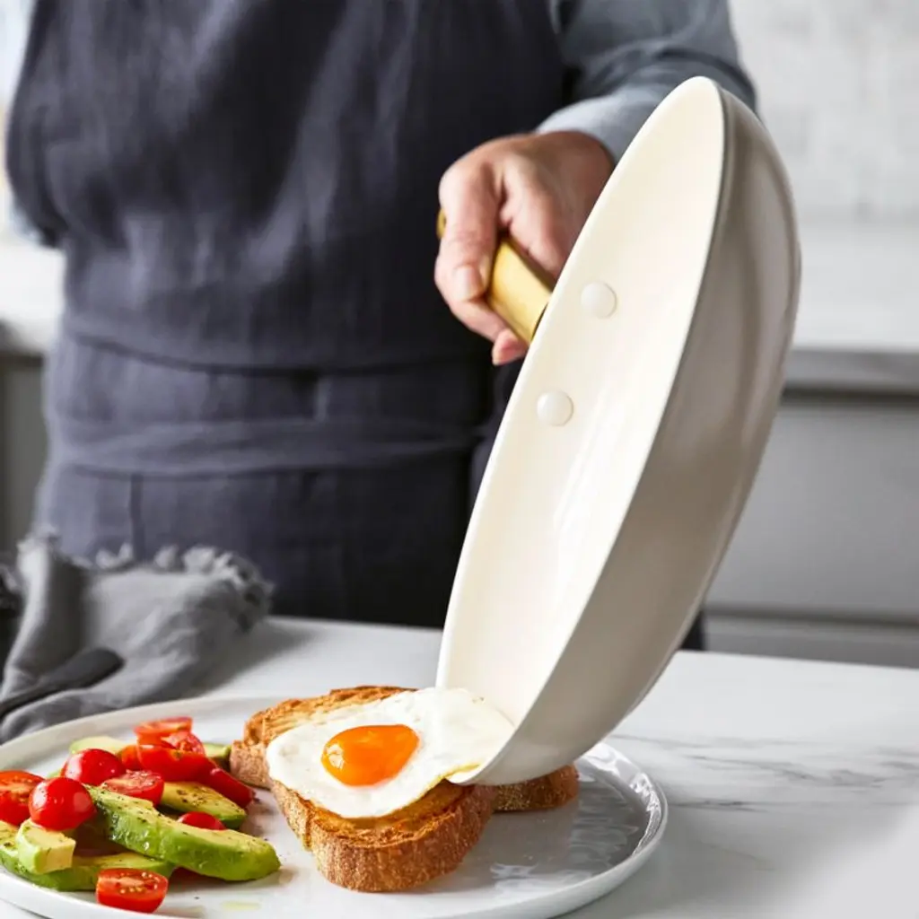 This GreenPan Reserve cookware set infuses world-class technology with modern, minimalist style. Matte gold handles adorn the sleek pans, contrasting with the creamy taupe finish and adding serious glam. Constructed with duo-forged, hard-anodized aluminum, the pans provide even heat distribution and superior performance. The diamond-infused Thermolon surface offers healthy cooking as well as easy release and clean up. And due to the advanced ceramic coating technology, you only need to cook on medium heat.
