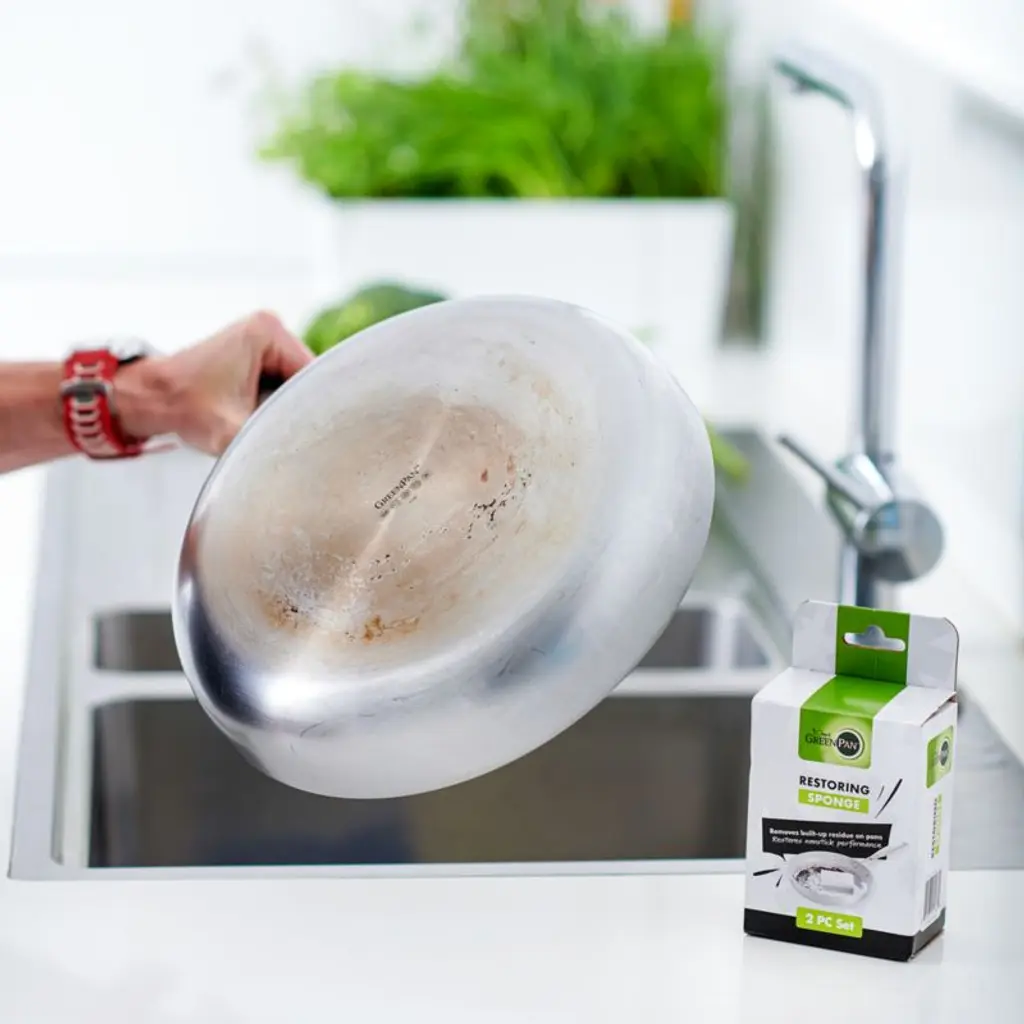 Tackle carbonizationthose sticky spots caused by burned oilon your non-stick cookware with these ingenious sponges. Made of melamine, the pair cleans pans with ease while protecting and restoring the ceramic non-stick finish. Once your cookware looks and performs like new, the sponges clean up easily in the dishwasher.View all GreenPan products