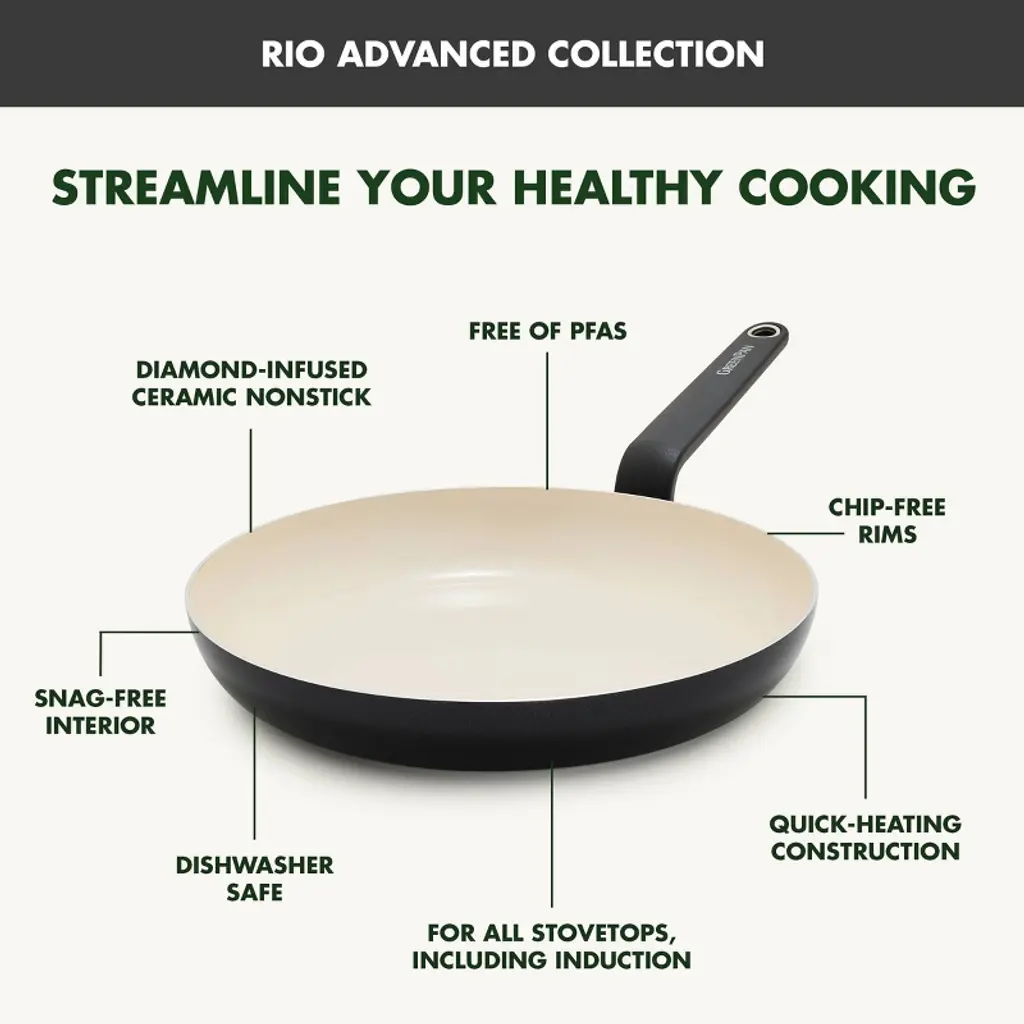 Take cooking to the next level with GreenPan’s Rio Advanced. Every detail is specially designed to make cooking easier. Featuring GreenPan’s signature diamond-infused ceramic nonstick, Rio Advanced delivers ultra-easy release, quick cleanup, and PFAS-free performance for worry-free cooking. The heat responsive bodies let you dial in your perfect temperature and the powerful induction-ready base ensures quick and even heat for incredible results on any stovetop. The smooth, rivetless interior eliminates food traps and wipes clean in seconds and the chip-resistant rims protect these pans at the edges. A sturdy, ergonomic handle provides a comfortable grip, while the durable glass lid locks in heat and flavor. Whether you're rinsing it clean or loading it in the dishwasher, Rio Advanced is built to perform day in, day out (and looks great doing it).