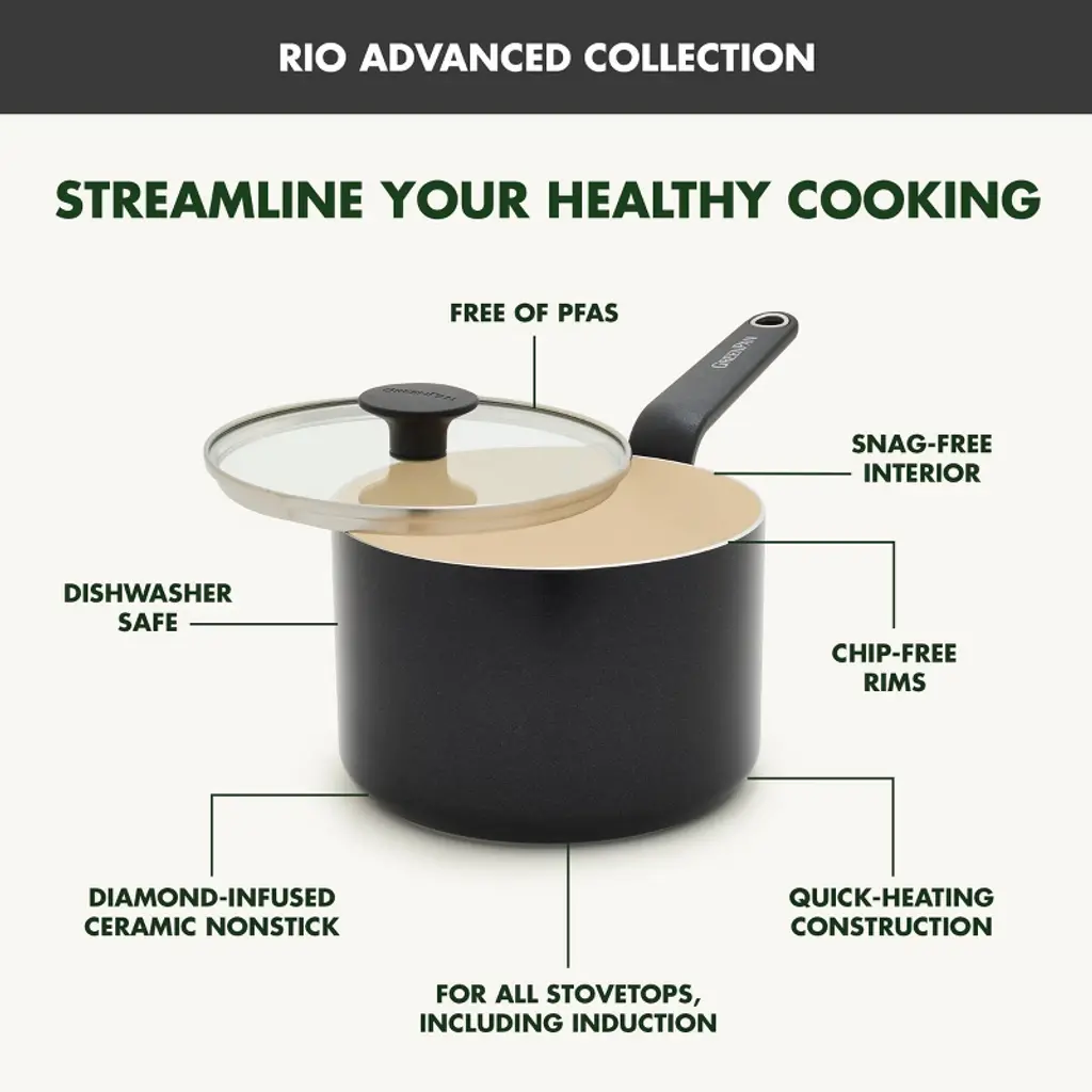 Take cooking to the next level with GreenPan’s Rio Advanced. Every detail is specially designed to make cooking easier. Featuring GreenPan’s signature diamond-infused ceramic nonstick, Rio Advanced delivers ultra-easy release, quick cleanup, and PFAS-free performance for worry-free cooking. The heat responsive bodies let you dial in your perfect temperature and the powerful induction-ready base ensures quick and even heat for incredible results on any stovetop. The smooth, rivetless interior eliminates food traps and wipes clean in seconds and the chip-resistant rims protect these pans at the edges. A sturdy, ergonomic handle provides a comfortable grip, while the durable glass lid locks in heat and flavor. Whether you're rinsing it clean or loading it in the dishwasher, Rio Advanced is built to perform day in, day out (and looks great doing it).