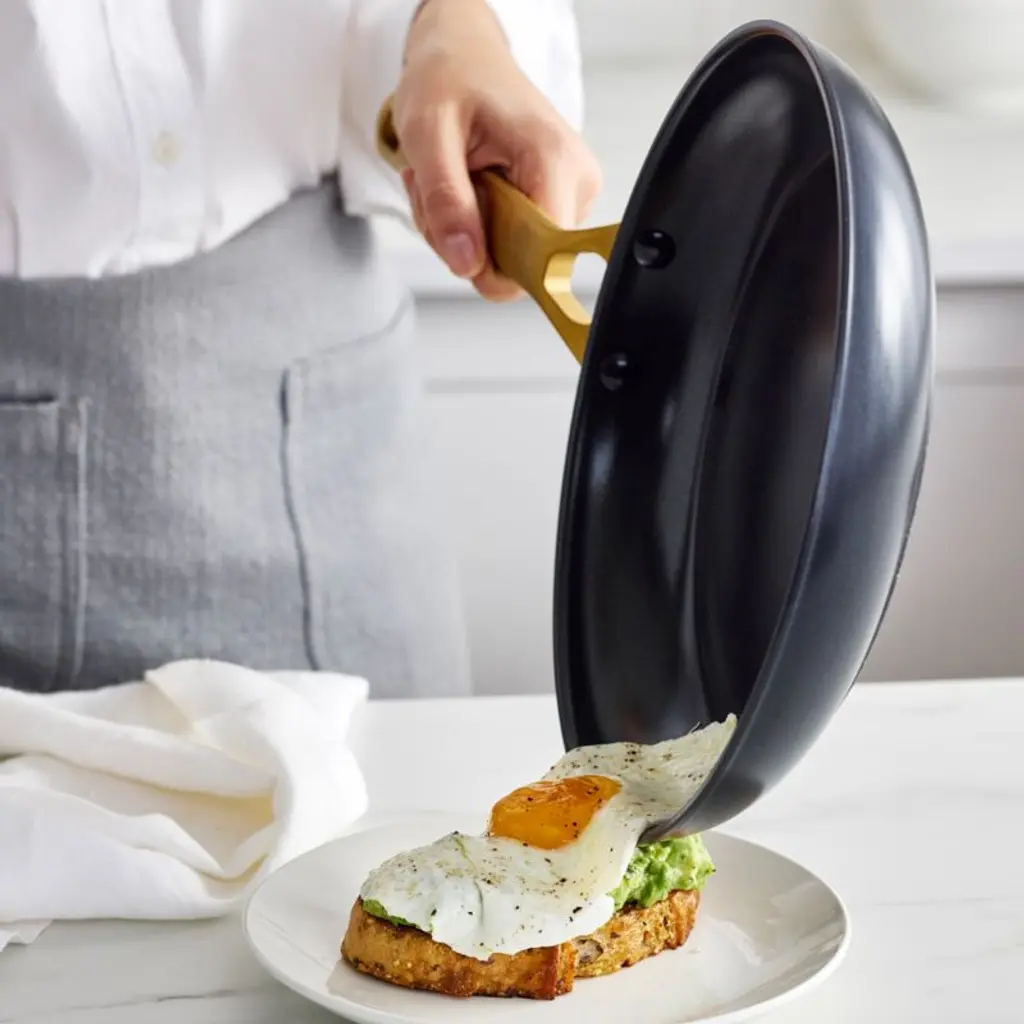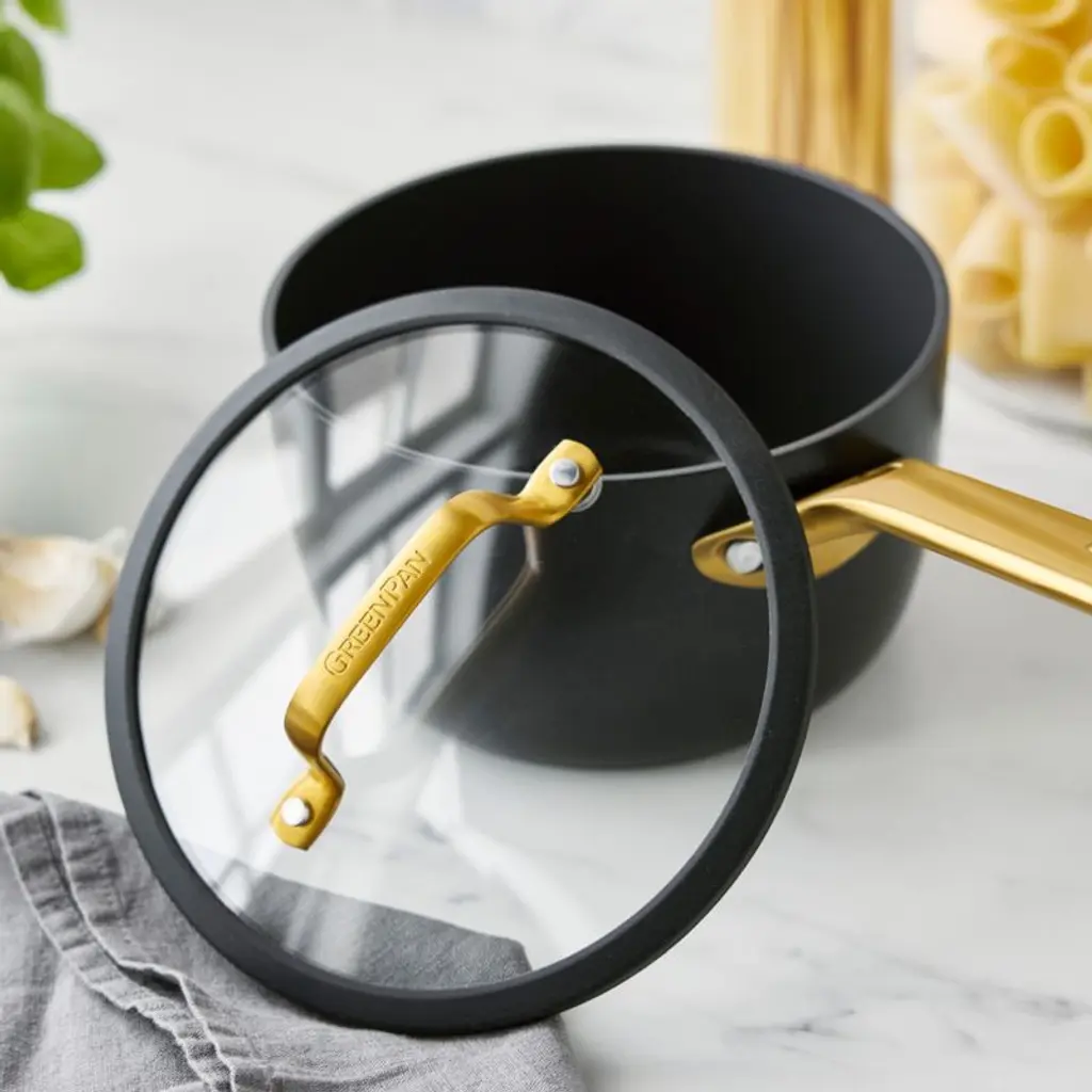 Coated in matte black inside and out, this 10-piece GreenPan Reserve Pro cookware set infuses world-class technology with bold, modern style. The hard-anodized aluminum pans are ultra-durable and superstrong, and their Thermolon 9G surfaces offer easy clean up and long-lasting performance. And due to the advanced non-stick coating that distributes heat effectively, you can sear with just medium heat. Fitted with matching silicone rims, the domed glass lids fit snugly without chipping the pans. We especially love the gold handles that add serious glam to the sleek cookware. A fabulous wedding, graduation or housewarming gift, this set consists of 8- and 10-inch fry pans, 2-quart saucepan with lid, 3.2-quart saute pan with lid, 5-quart casserole pan with lid, and an oyster-hued silicone turner and slotted spoonplus three bonus pan protectors and a Wonder sponge.