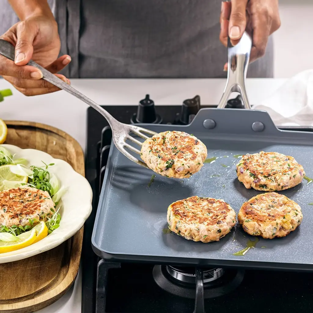 Valencia Pro brings together over a decade of innovations in one incredible collection. Designedto last, this griddle is crafted with strengthened hard anodized aluminum for extra durability andscratch resistance. The griddle features a sturdy Magneto base for superior induction efficiencyso you can brown, sauté, and sear without heat loss on any stovetop, including induction. Thegriddle also features our Thermolon Minerals Pro ceramic nonstick, a diamond-infused coatingthat’s metal utensil safe and designed to stand up to intense use while giving you even heating,effortless release, and easy cleanup. The griddle’s stainless steel handle lets you go fromstovetop to oven with ease and the dishwasher safe design makes cleaning up big messesstress-free. Oven safe up to 600°F. Limited lifetime warranty.
