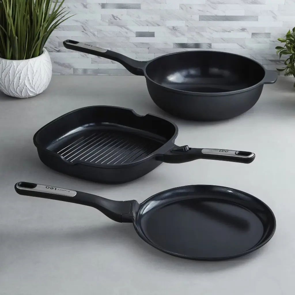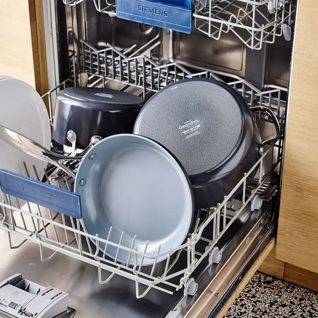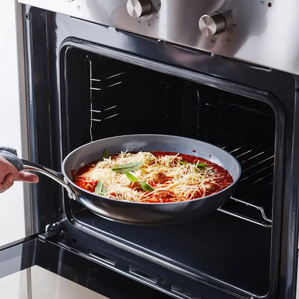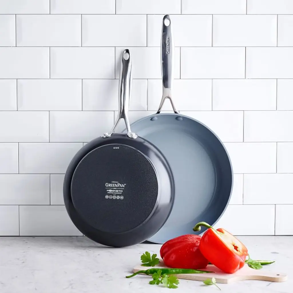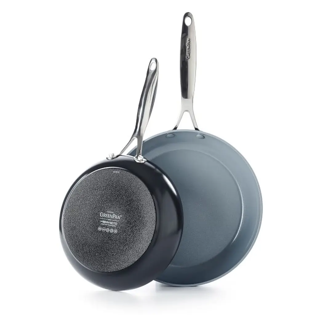 Designed for modern home cooks, Greenpan's® stackable stainless steel Frying Pan Set has an anodized ceramic coating that makes it nonstick and scratch resistant. The durable multi-layered stainless steel body retains heat and can be used on all stovetop surfaces. Includes one 10" frying pan and one 12" frying pan. Stainless steel ergonomic handle and base. Nonstick ceramic coating in a Silver finish. Ceramic nonstick surface is free of PFAS, PFOA, lead, cadmium and persistent pollutants–cookware will never release harmful fumes even when accidentally overheated. High-conduction coating for superb searing and frying. Imported.