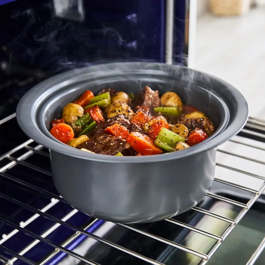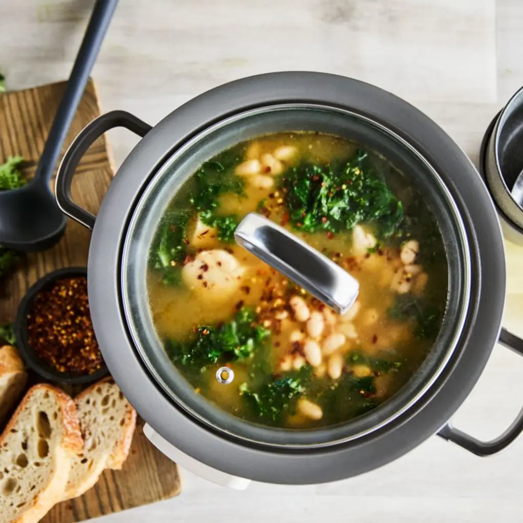 Coated in a creamy, matte finish inspired by macadamias, our exclusive GreenPan mini cooker offers versatility on a small footprint. The simple operation makes it easy to brown/saute, bake, reheat and more. Brown onions, vegetables and meats to create depth of flavor, then switch to low and slow cooking for making low-maintenance meals without changing pans. The mini cooker will keep your dish warm for up to eight hours so it's ready whenever you are. GreenPan's signature diamond-infused, non-stick ceramic coating and dishwasher-safe construction ensures easy cleanup after cooking.