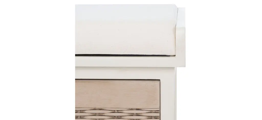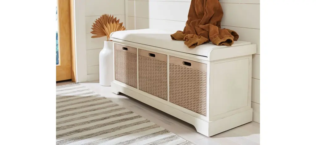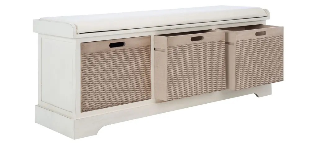 This Greenwich Cushion Storage Bench performs double duty as a stylish storage solution and perfect seating in an entryway or mud room. Landers gives your dcor a touch of contemporary farmhouse charm with its distressed white finish and three spacious basket drawers.