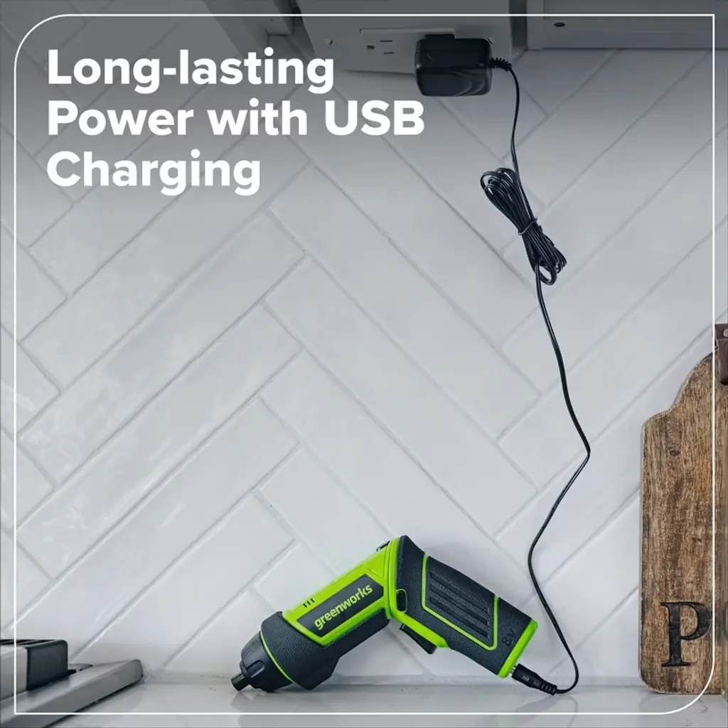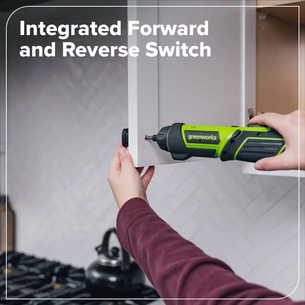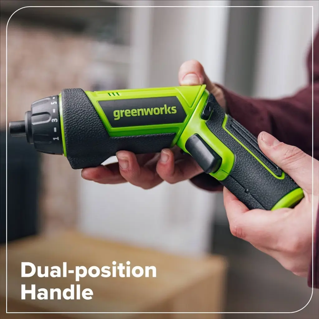 From assembling furniture to fixing appliances, tackle any task with ease with the Greenworks 8V dual position screwdriver. With a pivoting handle for straight or pistol grip positions, this versatile driver gets into tight spaces while delivering power for the job. This ultimate tool for DIYers, professionals, and home improvement enthusiasts makes every project faster and easier.