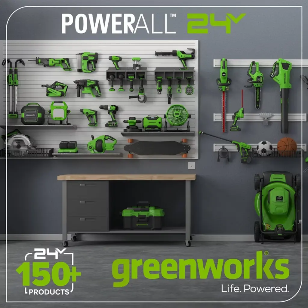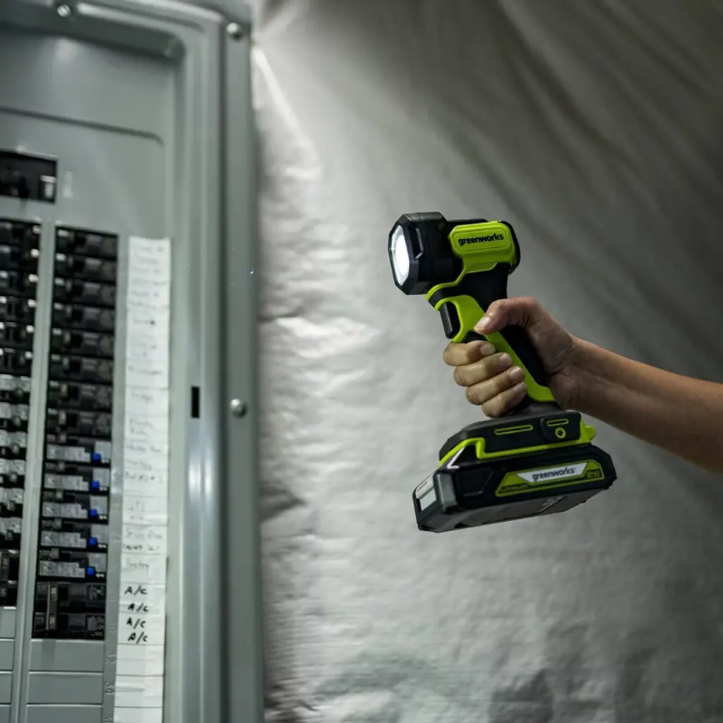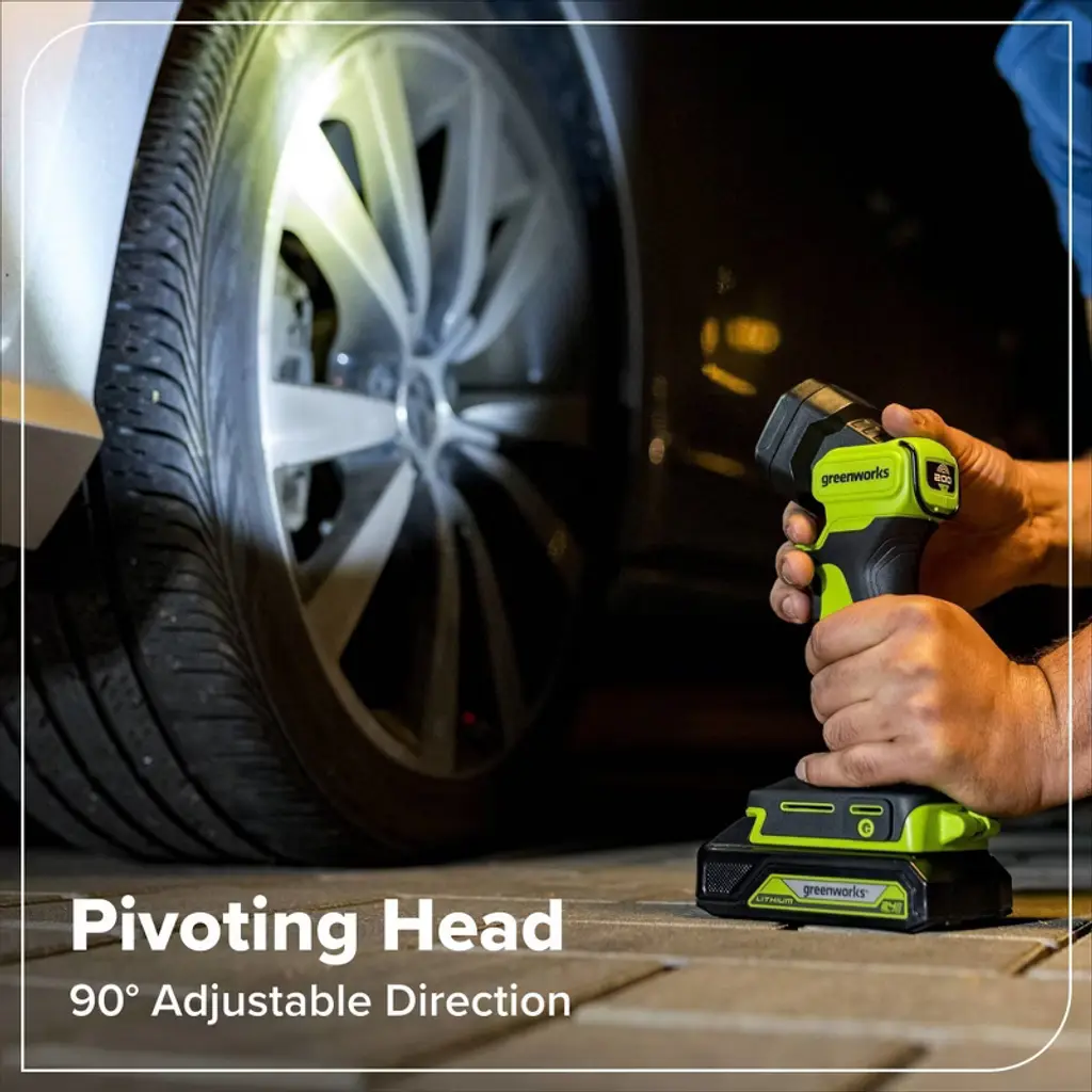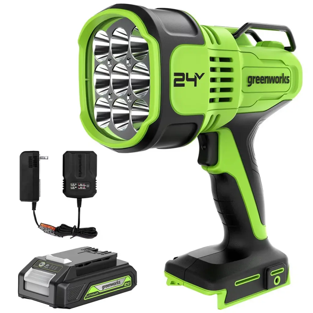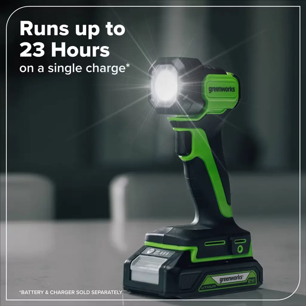 With 200 lumens of light output, 330-foot beam distance, and up to 23 hours of run time, the portable, lightweight Greenworks POWERALL 24V flashlight is perfect for any low light application. Additional features include a comfortable, ergonomic grip and 90° adjustments for pointing light where it's needed. The Greenworks POWERALL™ 24V lithium-ion battery platform powers over 150 indoor and outdoor products, including lawn mowers, blowers, string trimmers, chainsaws, power tools, vacuums, and more! Battery and charger sold separately.