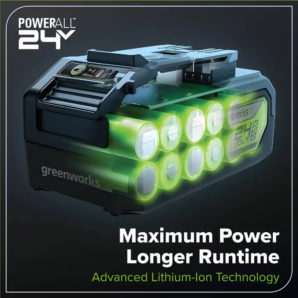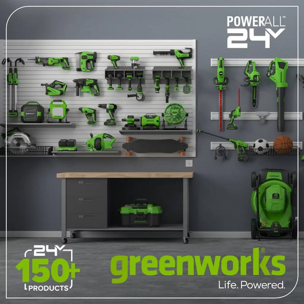 The portable, lightweight Greenworks POWERALL 24V cordless orbital sander features a high efficiency brushless motor with three speed settings that deliver 5,000 to 11,000 orbits per minute (OPM). Includes removeable dust bag, a variety of hook-and-loop sandpaper, 5" sanding pad, 2.0 Ah battery, and charger. The Greenworks 24V lithium-ion battery provides 20% more power and 35% more runtime (compared to 20-volt products) while delivering fade-free power with no memory loss after charging. The Greenworks POWERALL™ 24V lithium-ion battery platform powers over 150 indoor and outdoor products, including lawn mowers, blowers, string trimmers, chainsaws, power tools, vacuums, and more!