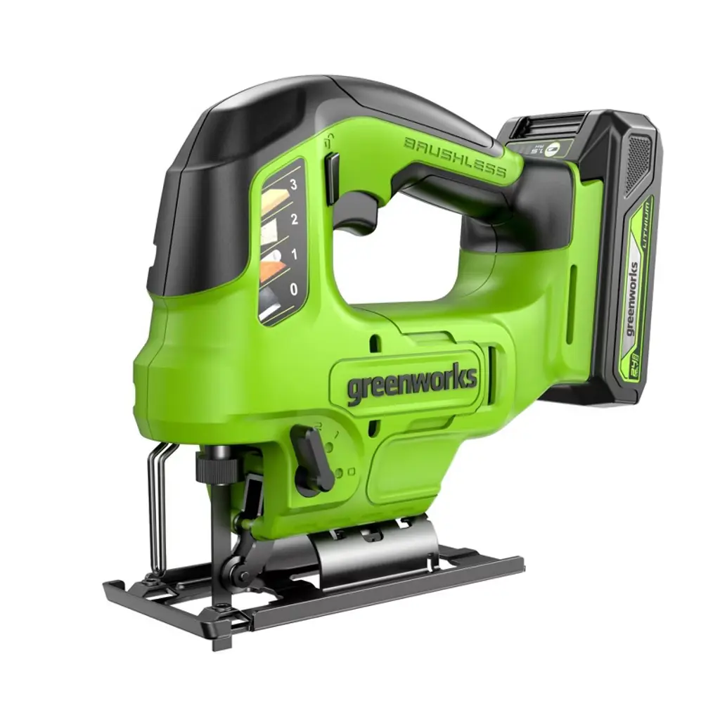 With six speed settings and 18,000 oscillations per minute (OPM), the compact, lightweight Greenworks POWERALL 24V Cordless Oscillating Multi-tool is great for sanding wood, cutting plastic and metal, sawing holes in drywall, polishing, scraping, removing tile adhesive, and more. The 3.2-degree oscillation angle provides faster, more aggressive cutting and sanding, and the tool-free clamping system makes accessory changes a breeze. Additional features include a built-in LED light that illuminates poorly lit workspaces and a cushioned overmold grip for comfort and less fatigue. Includes metal flush-cut blade, sanding pad, scraper blade, plunge-cut blade, and nine pieces of sandpaper. Battery and charger sold separately. Greenworks 24V battery powers 150+ Greenworks 24V products.