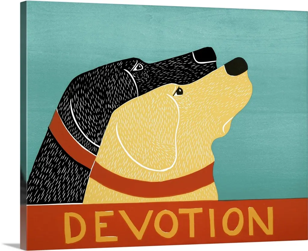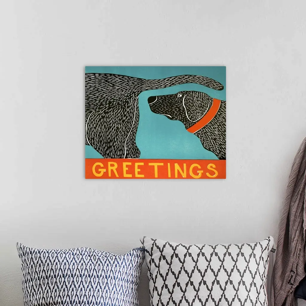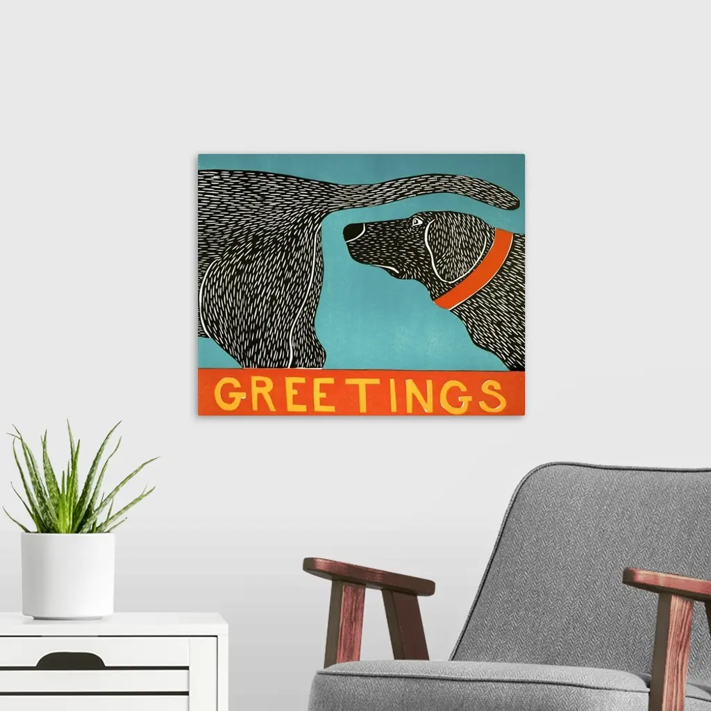 Illustration of a black lab sniffing another black lab's behind with the word "Greetings" written on the bottom.