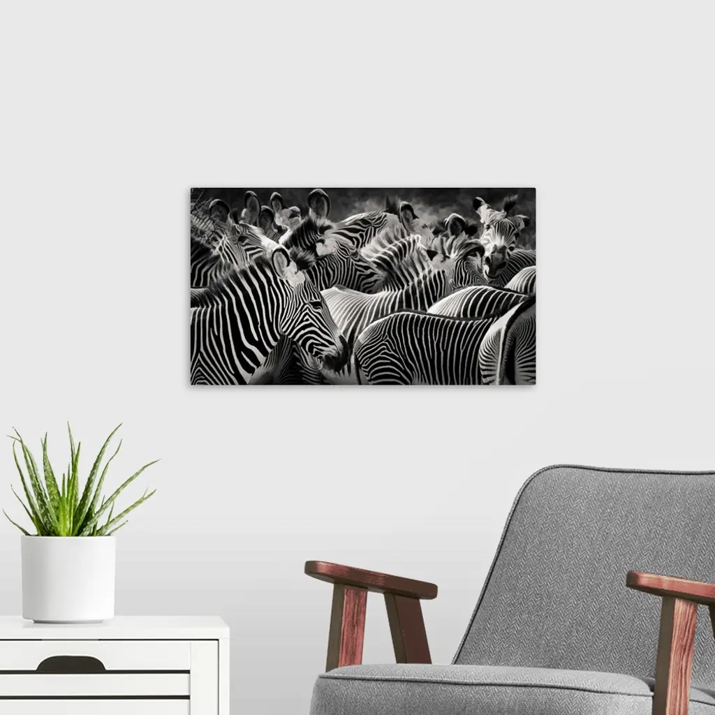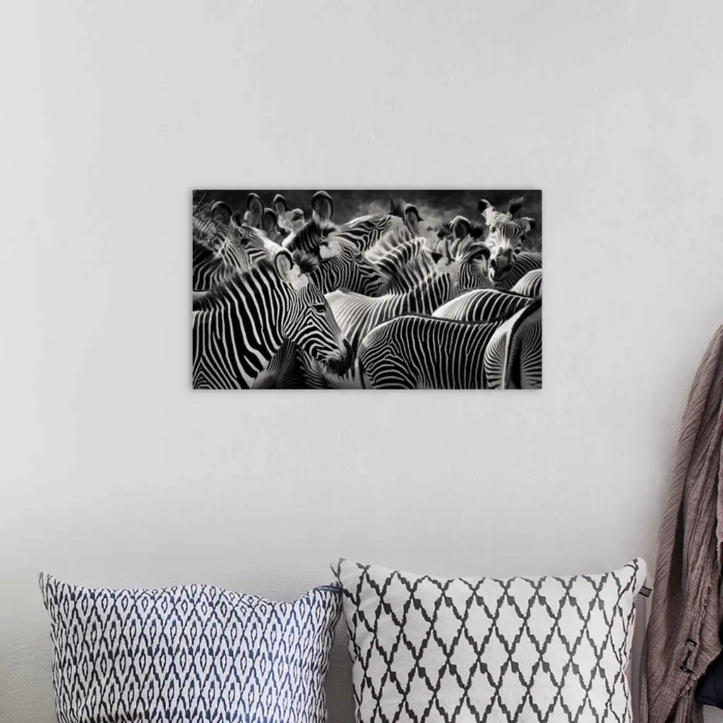 Panoramic close up of the patterns of stripes and markings of a herd of zebra in black and white in Samburu, Kenya in summer.