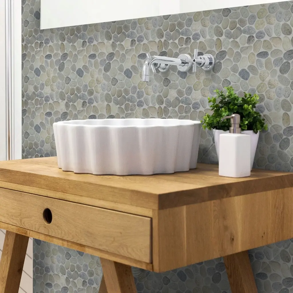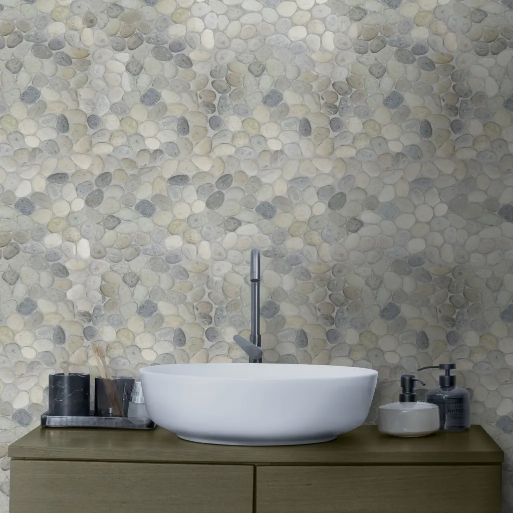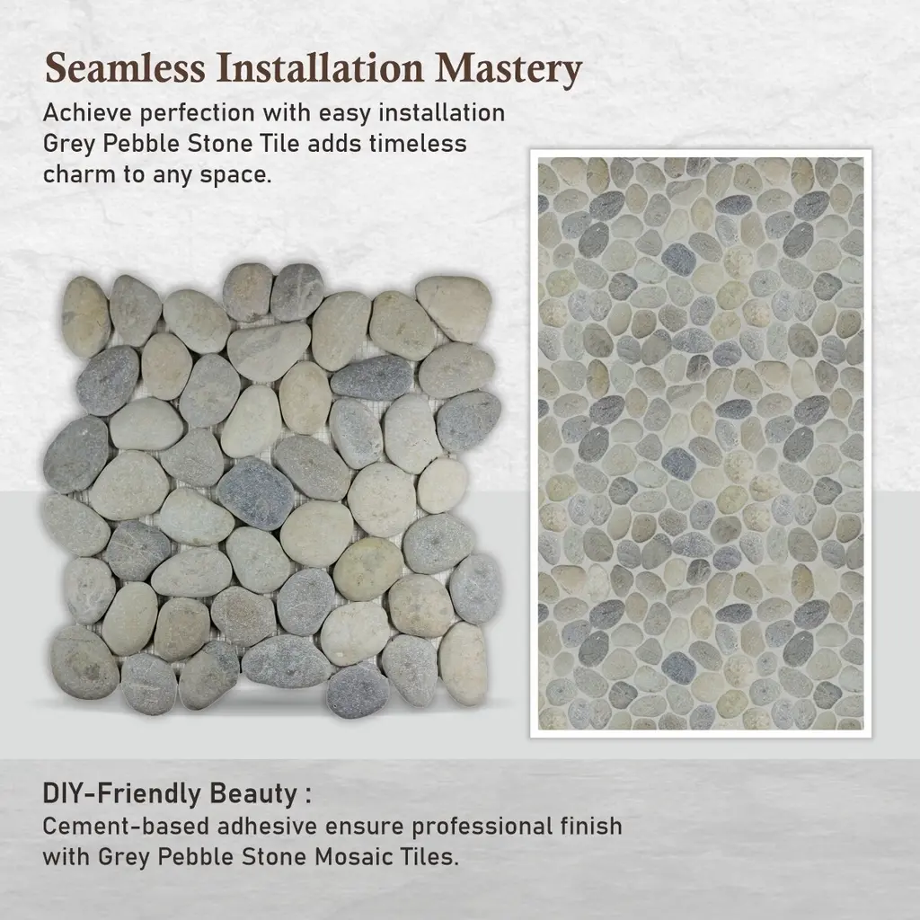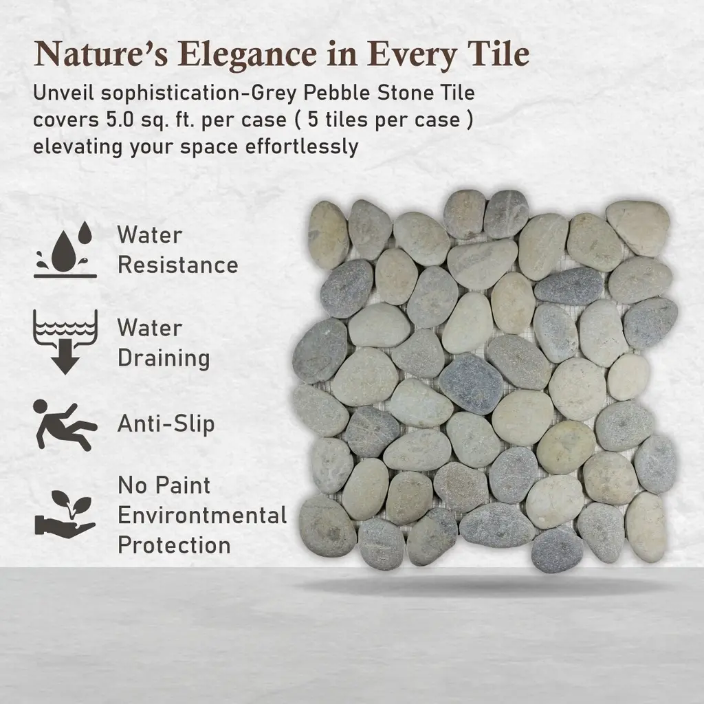 Natural Pebble tile mosaics are a popular decorative finish due to their durability, texture, range of color and many applications. They can be used indoors and outdoors on driveways, patios, steps, pathways, steps, swimming pools, showers, kitchen, flooring, fireplaces and countless other residential and commercial applications.[ Covers 5 sq. ft. | 5 tiles per case ]CLASSIC AND ELEGANT DESIGN : Enhance the overall aesthetic of your space with b.o.i. With our natural pebble mosaic tiles, You can get a sophisticated touch in your homes, from floors and walls to backsplashes and outdoor areas. The Pale is the perfect color palette for places where you desire a clean and calming atmosphere.VERSATILE EXCELLENCE ACROSS SPACES: Ascending to prominence, these tiles emerge as the preferred choice across diverse environments. From shower floors, where their water-resistant qualities provide functional allure, to decking areas offering durability and visual allure, and extending seamlessly to pool boundaries, they epitomize adaptability in design.SEAMLESS INTERLOCKING: The flat and polished finish of the pebble mosaic tiles makes them blend seamlessly into your design. b.o.i.tiles also create a smooth and continuous surface, enhancing the overall aesthetic of your space. Their consistent 12 x 12 size makes them easy to install, allowing you to achieve a polished and professional look effortlessly.ANTI-SLIP SURFACE: Perfect for shower floors and poolside edges, these tiles prioritize safety with their anti-slip surface. Enjoy the beauty of natural pebbles underfoot without compromising on security, making them an excellent choice for wet and high-traffic areas.ELEGANT BOUNDARIES AROUND POOLS: Redefine the aesthetic of pool areas with the mosaic's inherent elegance. Whether used to delineate POOL BOUNDARIES or enhance the surrounding landscape, their water-resistant properties and captivating design contribute to an inviting and cohesive atmosphere for leisure and relaxation.LONG LASTING AND DURABLE: Made with durability in mind, b.o.i pebble mosaic tiles are built to withstand high-traffic areas. Our mosaic tiles ensure longevity without sacrificing style, whether in homes or commercial spaces. They are installed using a cement-based adhesive, which provides a solid and lasting bond, securing them firmly in place despite daily use.