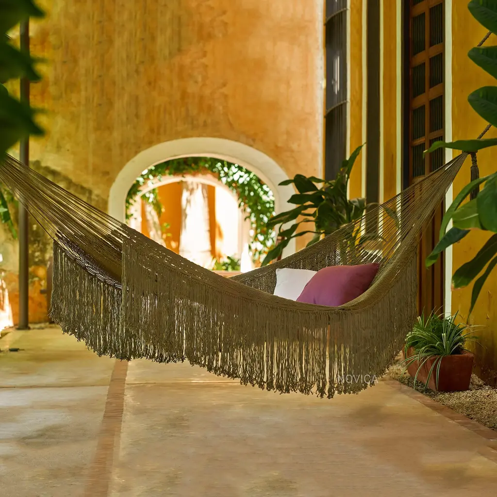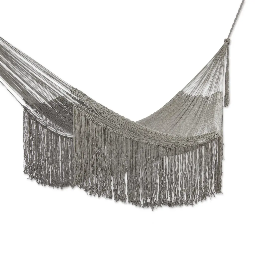 Make your backyard an oasis with this beautiful double hammock from Maya Artists of the Yucatan. Woven in the traditional Maya style from 100% cotton yarns, the grey rope hammock features long, luxurious fringe on both sides.