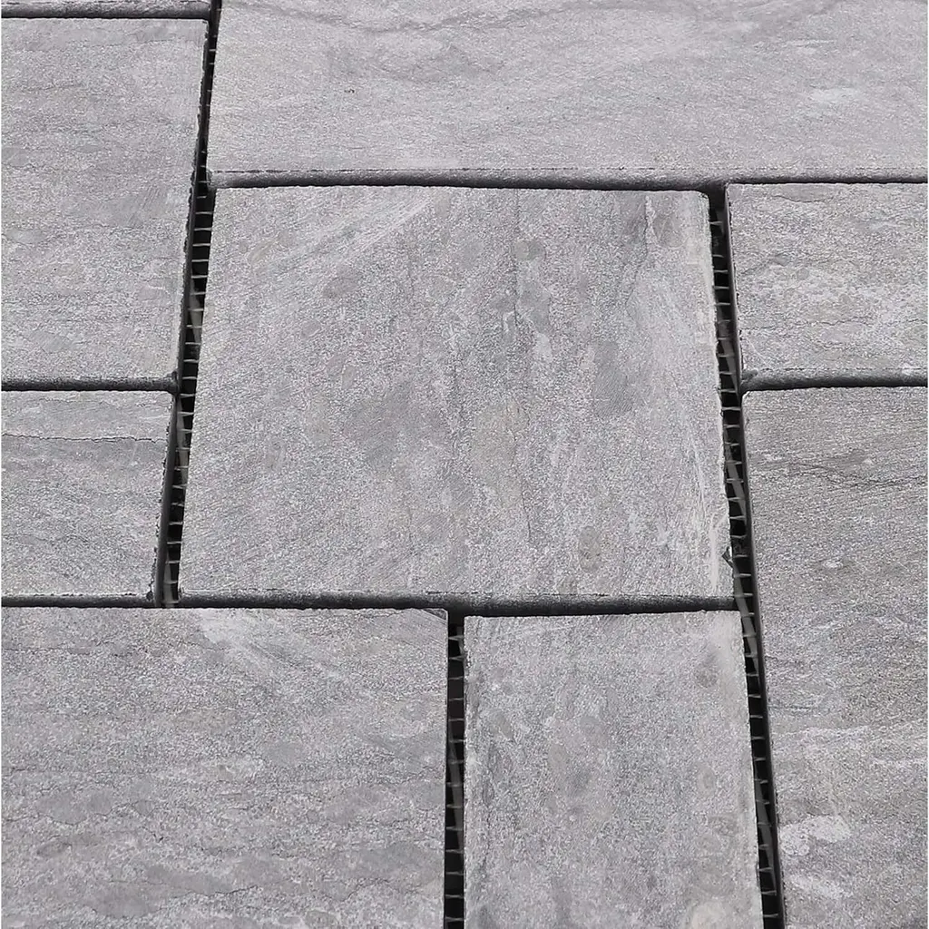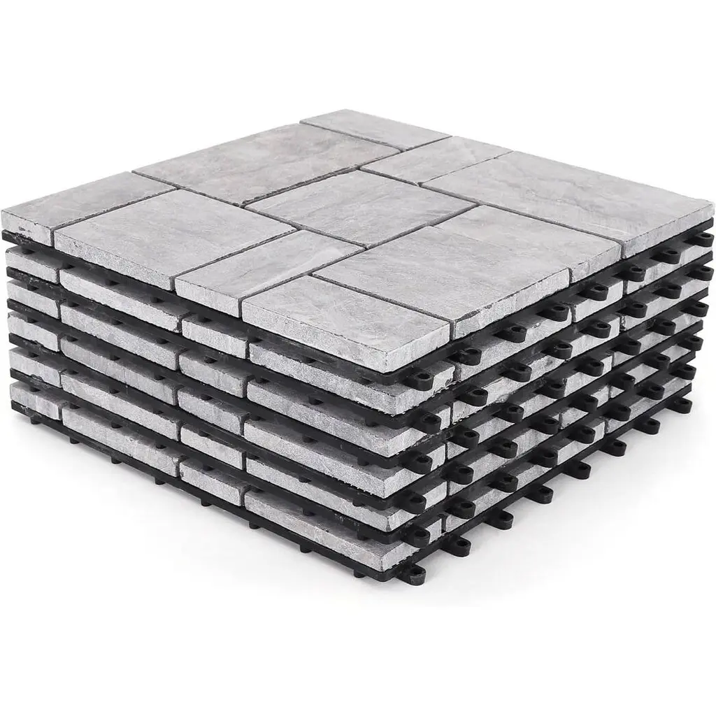 3rd Street Inn Stone Deck Tiles are made from 100% slate tile. Slate is known for its excellent resistance to rot and decay from outdoor elements including rain, sun, mold, mildew, and insects. 3rd Street Inn stone outdoor tiles feature uniquely shaped, smooth stones that give a beautiful, natural look to any indoor or outdoor space. Each piece of balcony flooring is durable enough to withstand the outdoor elements, yet soft and comfortable enough to feel great on bare feet.Features: Easy installation / no hardware needed Indoor and outdoor deck flooring Versatile installation options Dimensions: 12 inches long x 12 inches wide x 1 inch tall