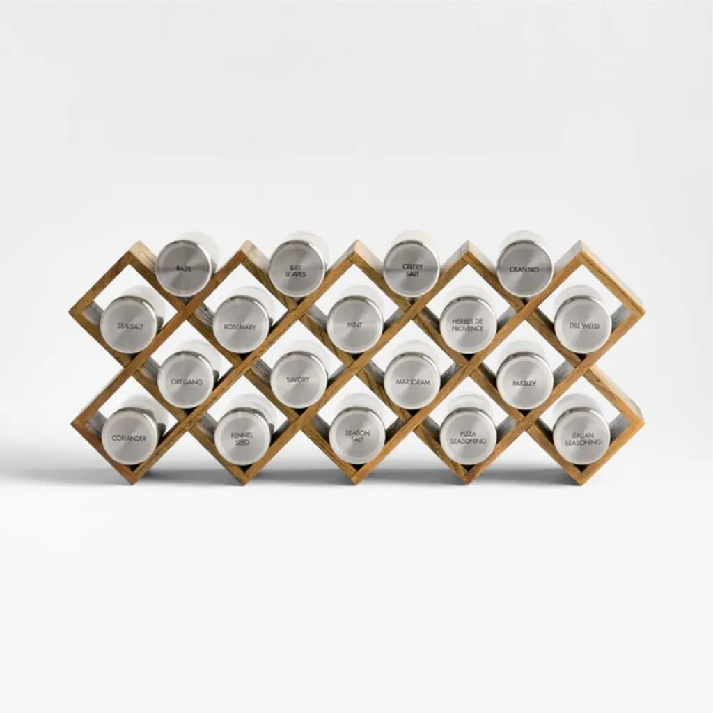 Grey-washed wood crisscrosses a spice rack in a three-in-one design that can stand on its own, be mounted on the wall or tucked into a drawer. Occupying the nooks are 18 glass jars filled with savory spices and outfitted with stainless steel caps and sifter disks for easy dispensing. Spices include: basil, bay leaves, celery salt, cilantro, coriander, dill weed, fennel seed, herbes de Provence, Italian seasoning, marjoram, mint, oregano, parsley, pizza seasoning, rosemary, savory, sea salt and seasoning salt. As an extra bonus, the set includes a free refill offer, good for five years.