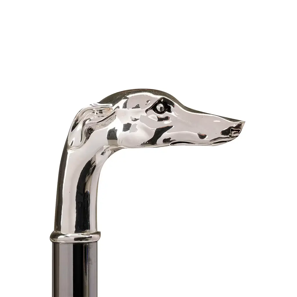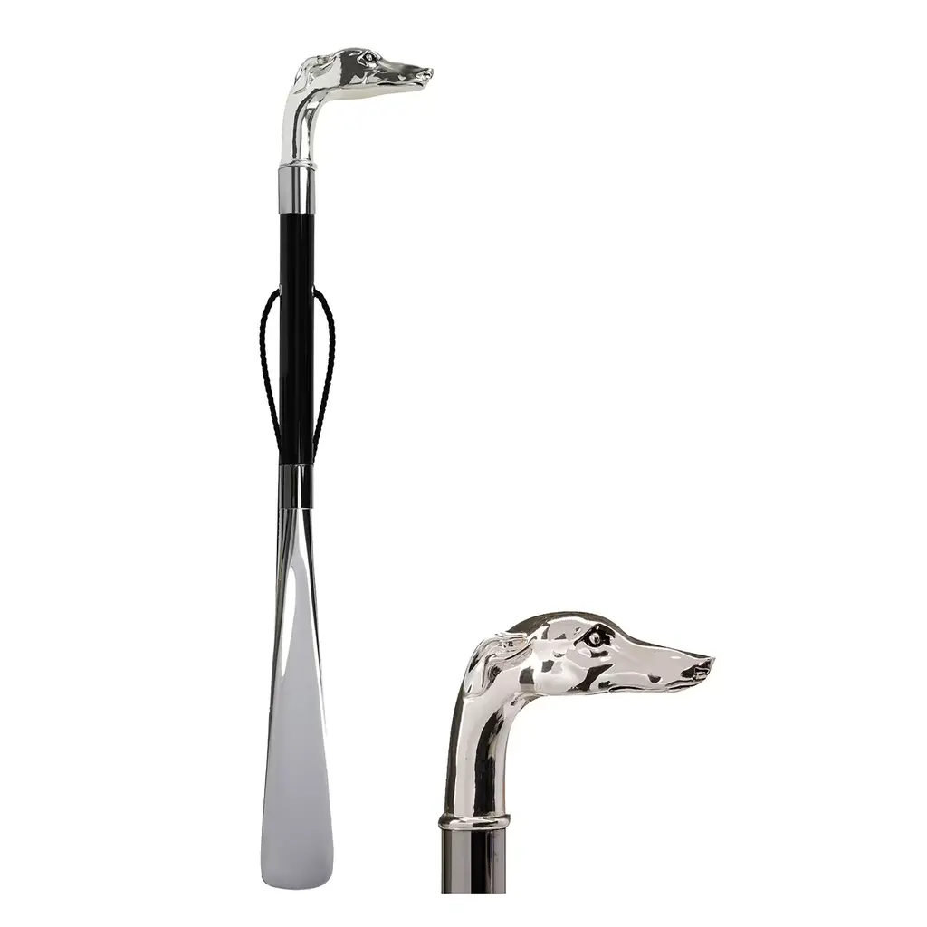 The upstanding flair of greyhounds is encapsulated in the zoomorphic handle of this ornamental shoehorn, luxe accessory that is handcrafted and equipped with a branded case. Coated with sterling silver and fashioned of marble powder, the handle is connected to the beech shaft lacquered glossy black, which tops the silvery paddle in ABS. Silver-finished brass rings keep the elements in place. An integrated loop allows for practical hanging.
