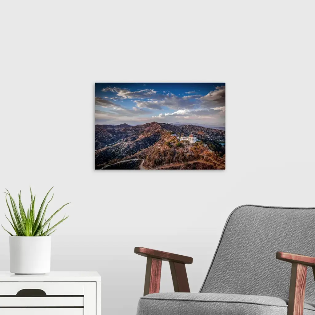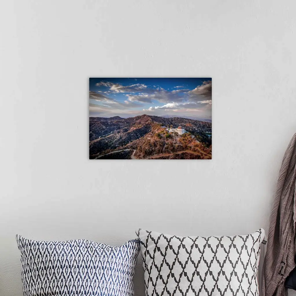 Aerial view of the Griffith Observatory on the hills outside of Los Angeles, California, at sunset.