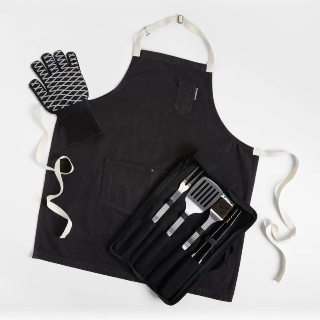 Everything for the grill master on the go, this gift-worthy set covers all the essentials. Packed in its own black carrying case, our exclusive barbecue tool collection features a turner, fork and tongs made with heavy-gauge stainless steel and a copper mesh grill brush. Our durable black denim apron with a Crate & Barrel logo tag provides the grill chef with two waist pockets, a chest pocket and adjustable straps. The set rounds out with a high-performance, heavy-duty and heat-resistant grilling glove that's perfect for handling hot cookware and utensils. The glove's form-fitting flexible cuff protects the forearm, and the glove can be worn on either the right or left hand.
