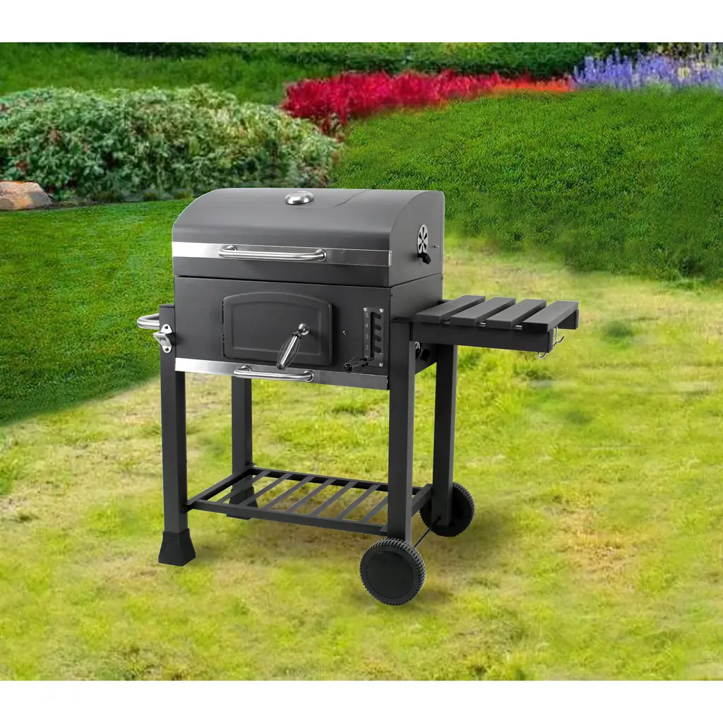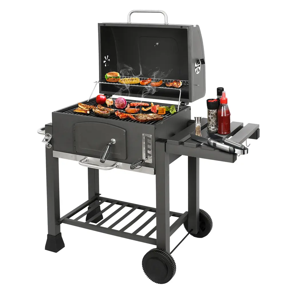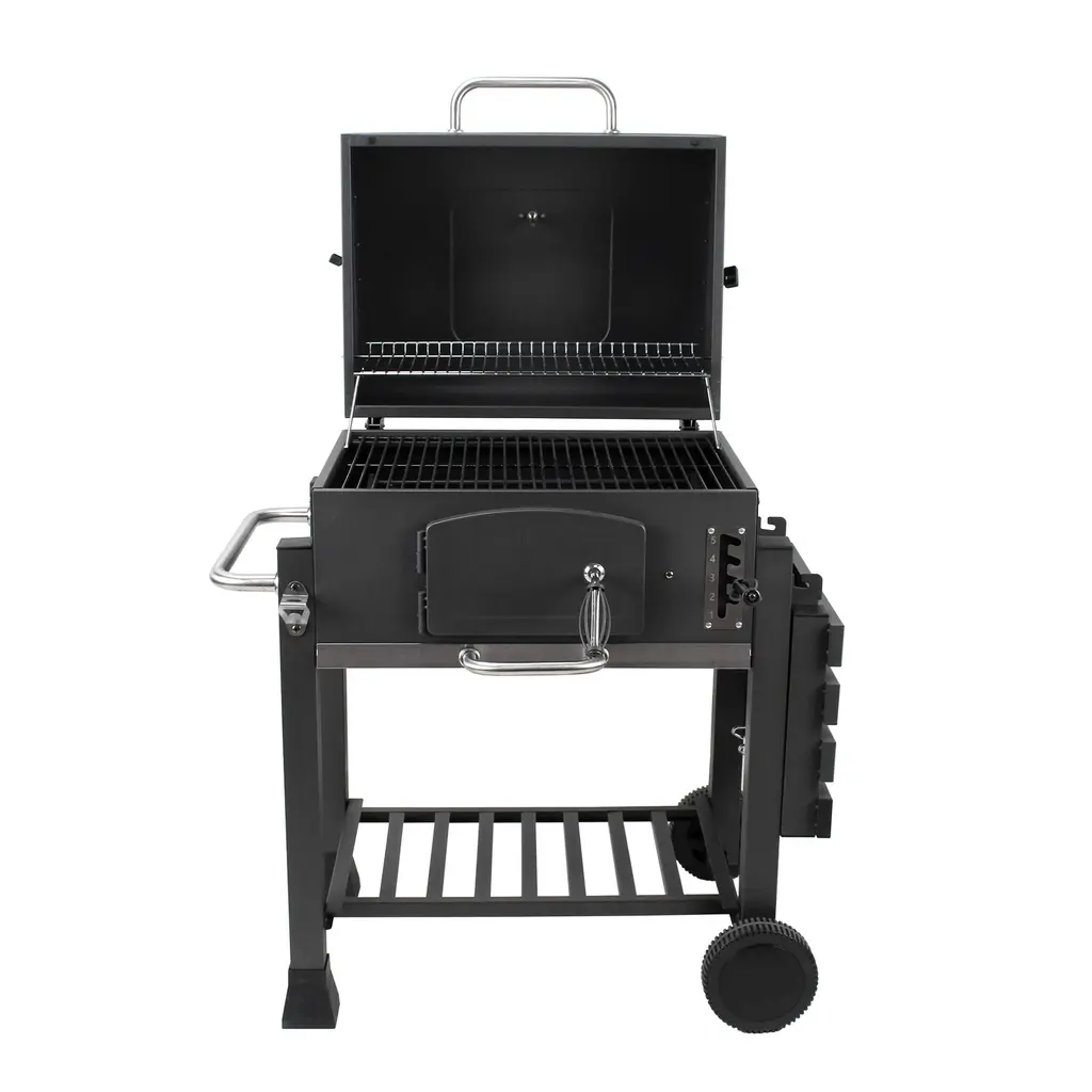Entertain your family and friends with the Grillfest 24in charcoal grill. EASY ASSEMBLYHood material: 0.7mm steel with grey powder coated, single wall*Fire box material: 0.7mm steel with grey powder coated finish,*Cooking grid material: steel wire with Enamel finish, (420*277mm)2 pieces, thickness:4.0mm,*Warming rack material: steel wire with chrome plated, Diameter:5*3mm *Warming rack supporter material: steel wire with chrome plated, thickness:5mm*1 piece SS round tube lid handle*Stainless steel thermometer on hood*New quickly assembly Black enamel charcoal tray with crank-up system, thickness: 0.8mm*With grey powder coated charcoal door in front of fire box*1 piece grey powder coated ash pan thickness: 0.7mm with 1 piece SS round tube handle*Quickly assembly foldable side shelf (0.7mm/0.6mm) on right side, with 4 pieces Hook On Side Table*1 piece quickly assembly SS round tube handle on left side*With 1 pc S/S bottle opener on the leg*Grey powder coated trolley*Leg material: 0.7mm steel with grey powder coated finish, with 2pcs of plastic plug*Bottom shelf: 0.7mm steel with grey powder coated finish*2 pieces normal plastic wheels with cap*Stamping logo on decoration sheet of the lid*Air vent: 0.7mm SS