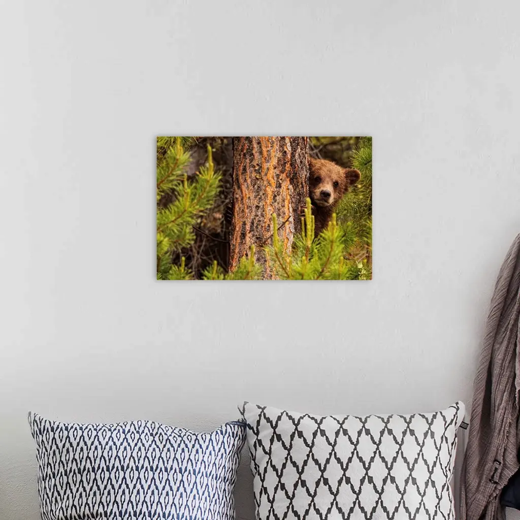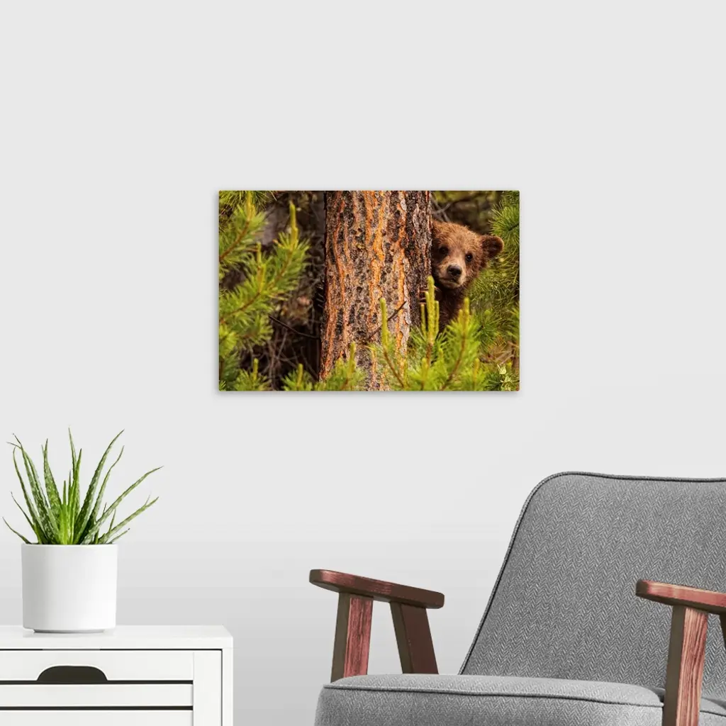 Grizzly Bear Cub Up A Tree, Yukon, Canada wall art for home and office decor. Discover canvas art prints, photos, mural, big canvas art and framed wall art in GreatBigCanvas.com's varied collections.