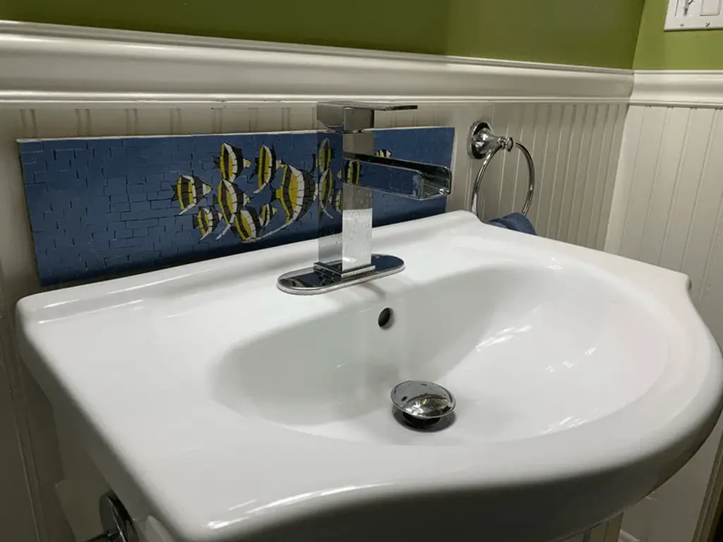 Introducing our exquisite "Group of Fish in the Blue Sea Marble Mosaic," a stunning piece of art meticulously handcrafted from premium natural stones and marbles. This vibrant mosaic features a whimsical depiction of a group of Moorish Idols swimming gracefully in the serene blue sea, capturing the beauty and tranquility of ocean life. Perfect for transforming any space, this unique mosaic can be elegantly displayed in your bathroom, pool area, seaside house, or cozy apartment. It serves as a captivating focal point that evokes a sense of calm and harmony, making it an ideal addition to various interior styles. Each piece is carefully crafted to ensure durability while showcasing the intricate details of the fish against the soothing blue background. The mosaic’s luxurious appeal is further elevated by the inclusion of exquisite Aqua Blue Quartz, whose luminous, crystalline hues shimmer with prismatic brilliance. These radiant jewel-like stones impart a captivating translucent brilliance that enhances the oceanic theme with vibrant depth and scintillating light. This shimmering quartz adds an irresistible cool-to-the-touch texture, enriching the mosaic’s tactile and visual allure. Whether you are looking to enhance your own living space or searching for a thoughtful gift for a loved one, the "Group of Fish in the Blue Sea Marble Mosaic" adds a touch of elegance and artistic flair to any environment. Elevate your décor with this beautiful mosaic that celebrates marine life and the stunning colors of the ocean. Dive into a world of creativity and charm with this remarkable piece – a true testament to the beauty of nature artfully captured in luxury stone. Don't miss the opportunity to bring this enchanting mosaic into your home today!