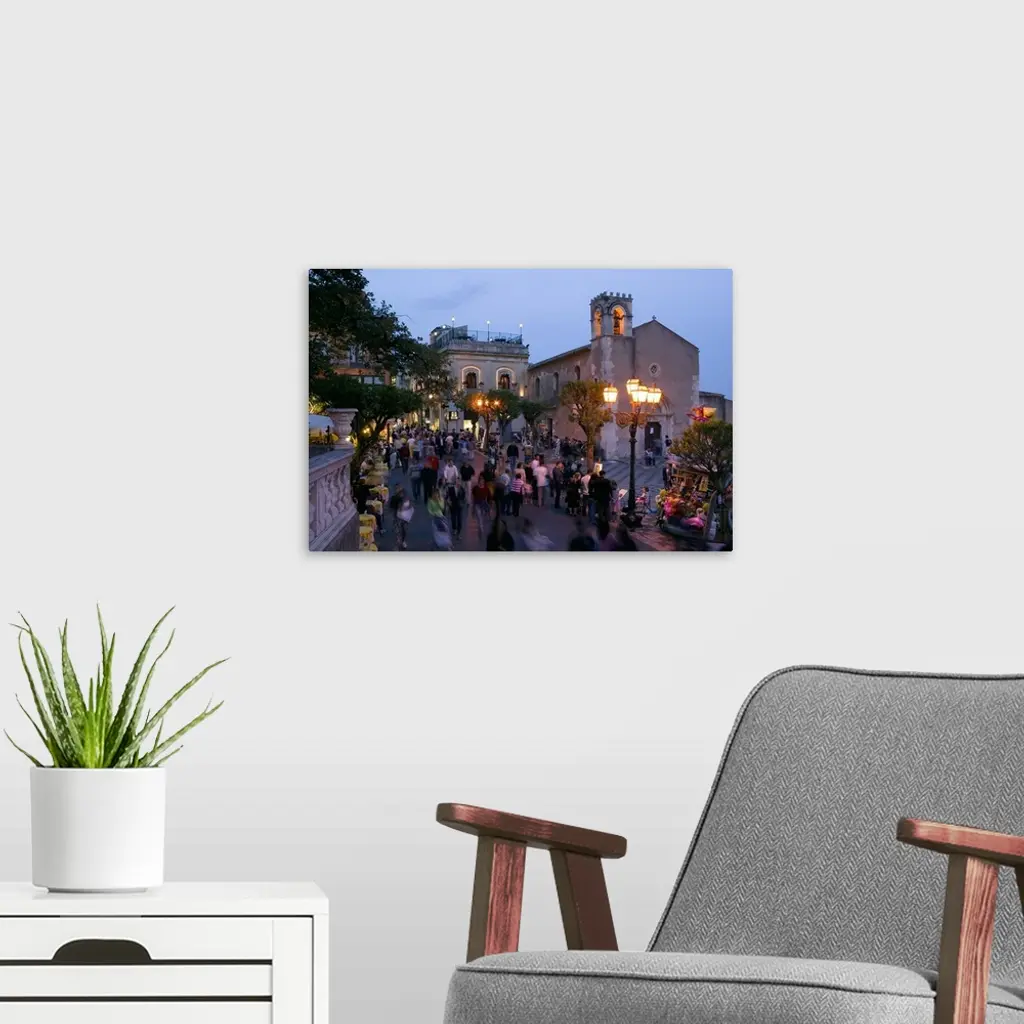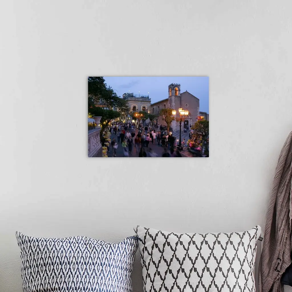 Group of people on the street at dusk, Piazza IX Aprile, Taormina, Sicily, Italy wall art for home and office decor. Discover canvas art prints, photos, mural, big canvas art and framed wall art in GreatBigCanvas.com's varied collections.