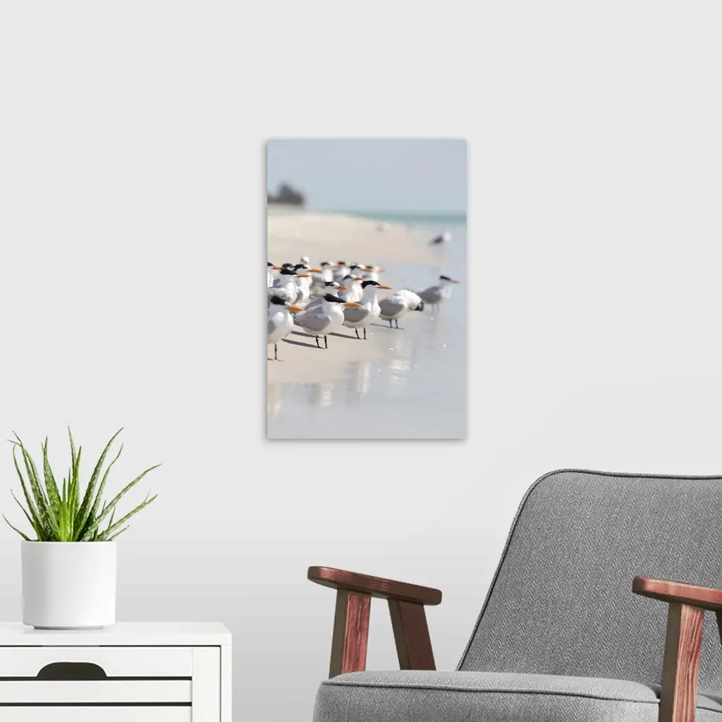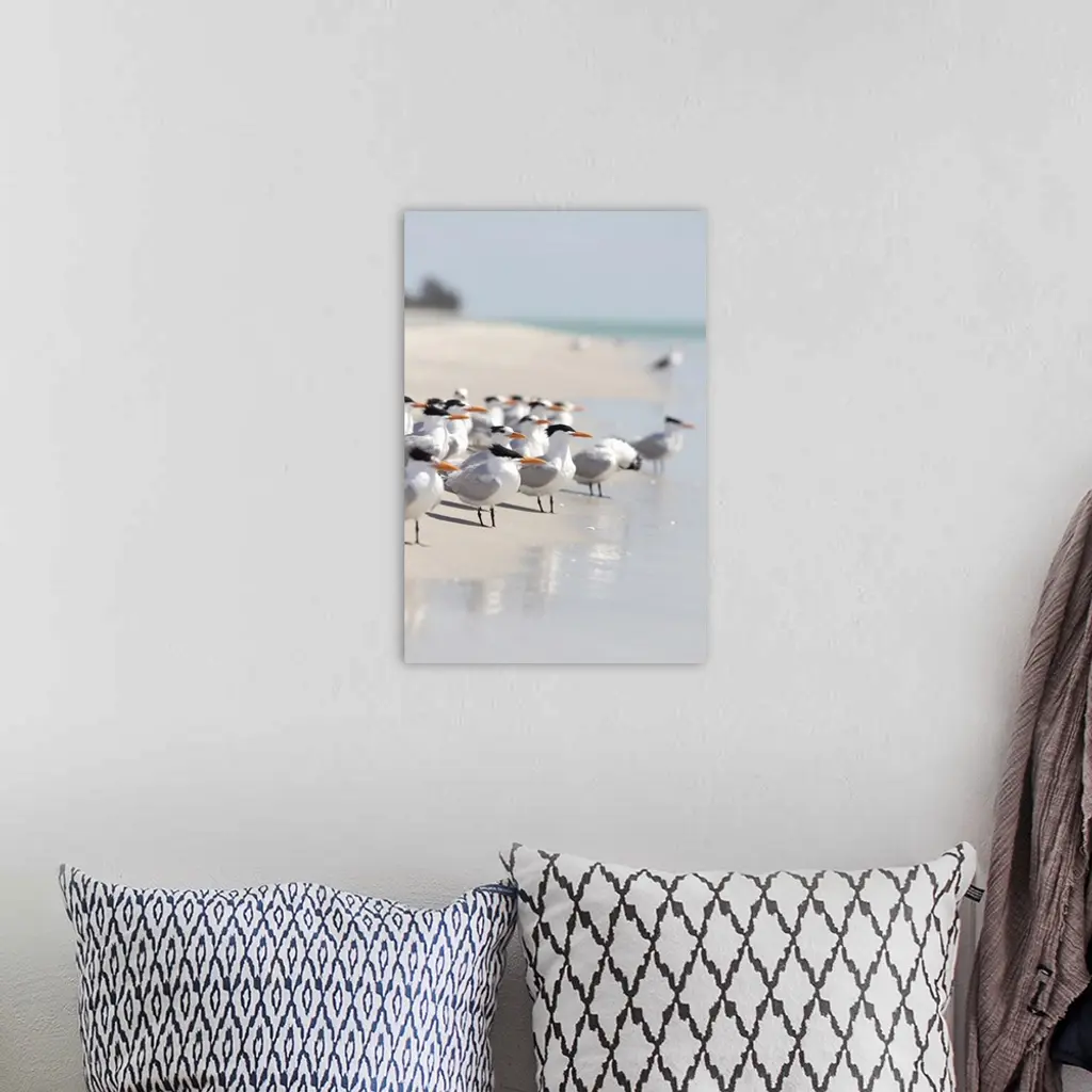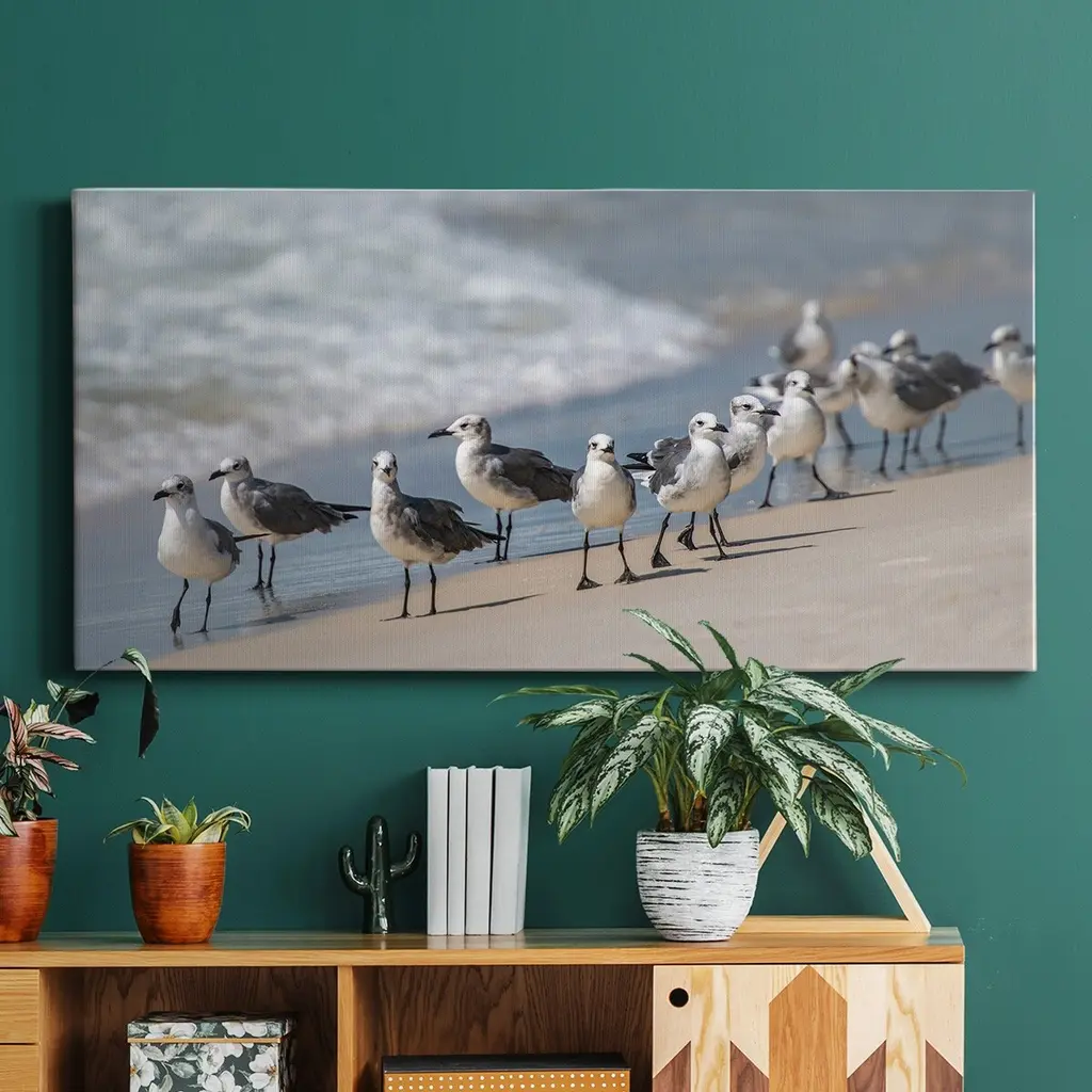 A beautiful piece for the home or office of a group of birds standing on the edge of the ocean water on a sunny day.