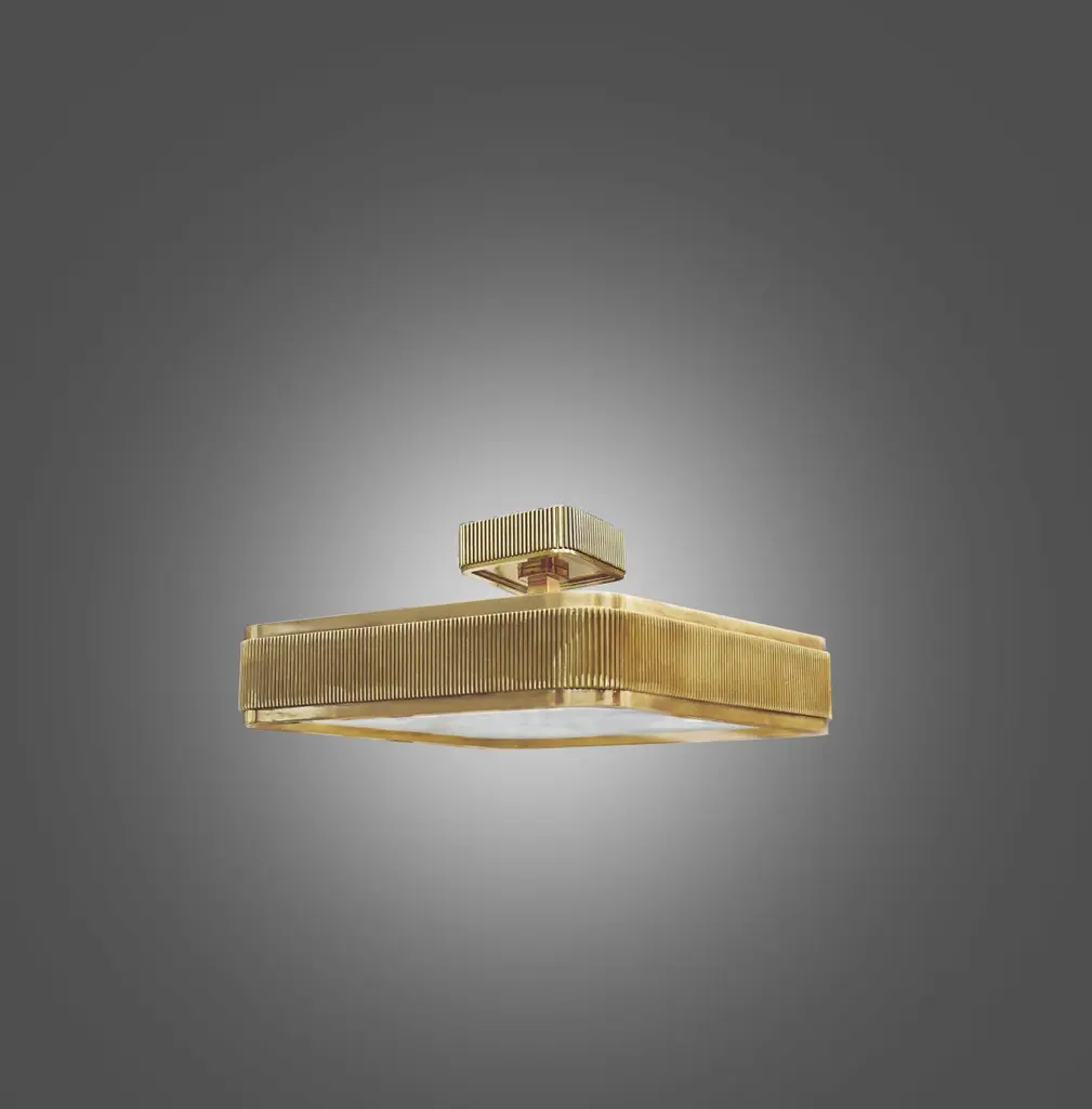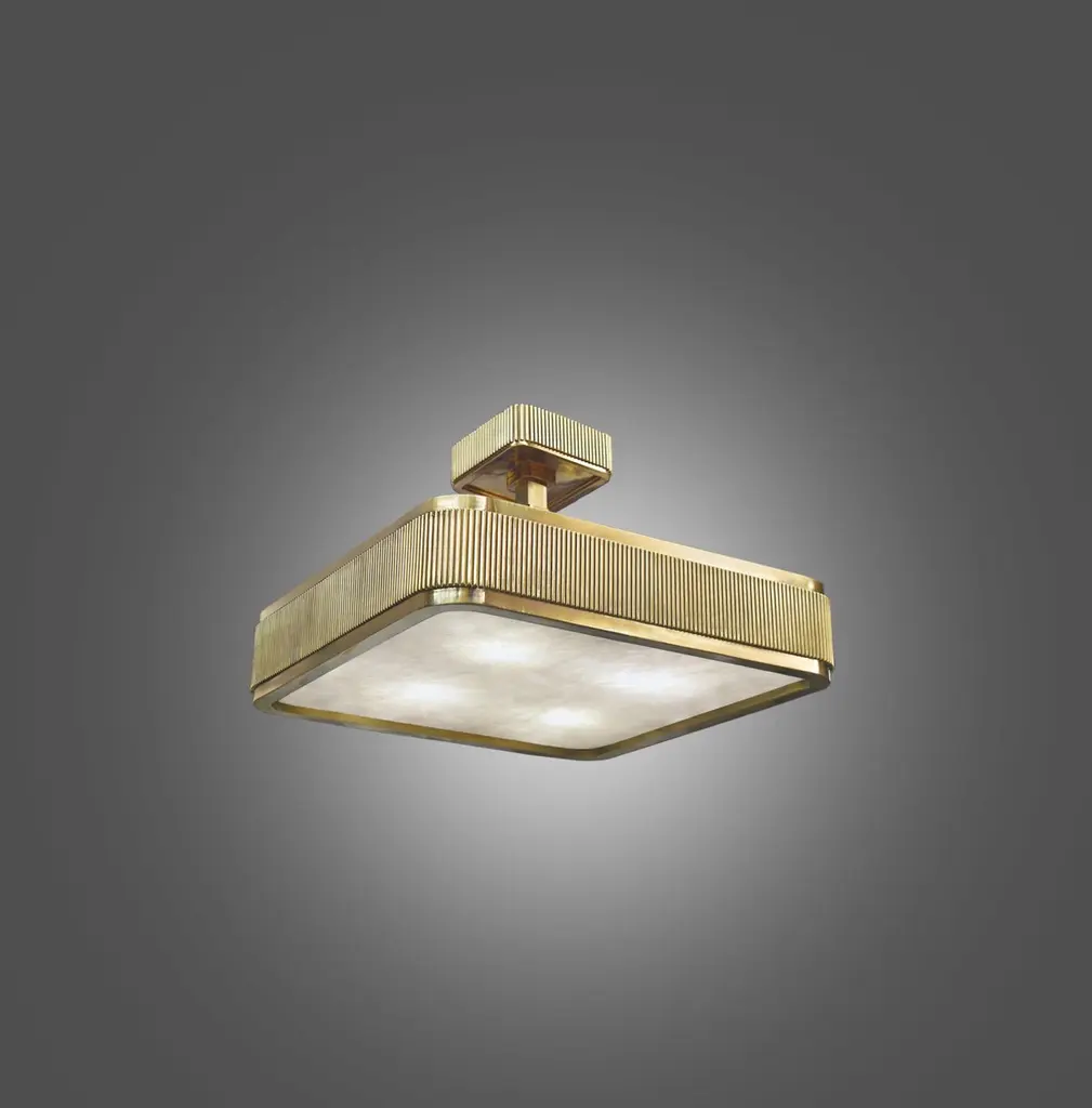 Group of two elegant form fixture with polished brass frame and rock crystal panel, BSO rock crystal semi flush mount created by Phoenix, NYC.Height can be adjustable.Lutron dimmer system. Each fixture installs four E26 base sockets. Use four 60W each LED light bulb. (240W total).