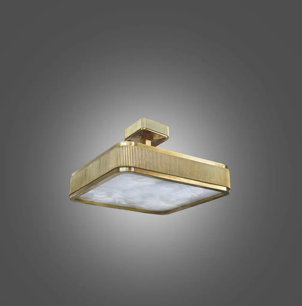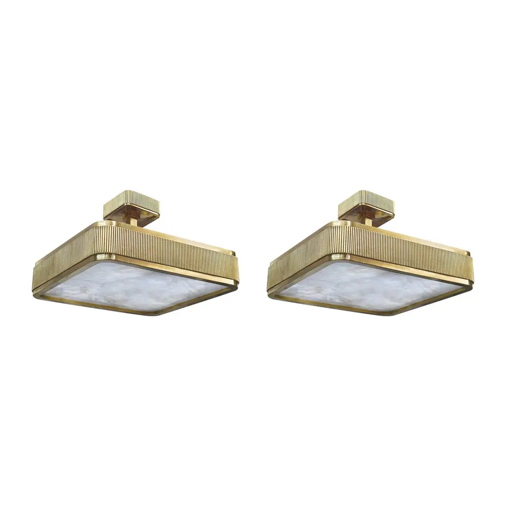 Group of two elegant form polished brass frame with rock crystal panel, BSO rock crystal semi flush mount created by Phoenix, NYC.Height can be adjustable.Lutron dimmer system. Each fixture installs four E26 base sockets. Use four 60W each LED light bulb. (240W total).