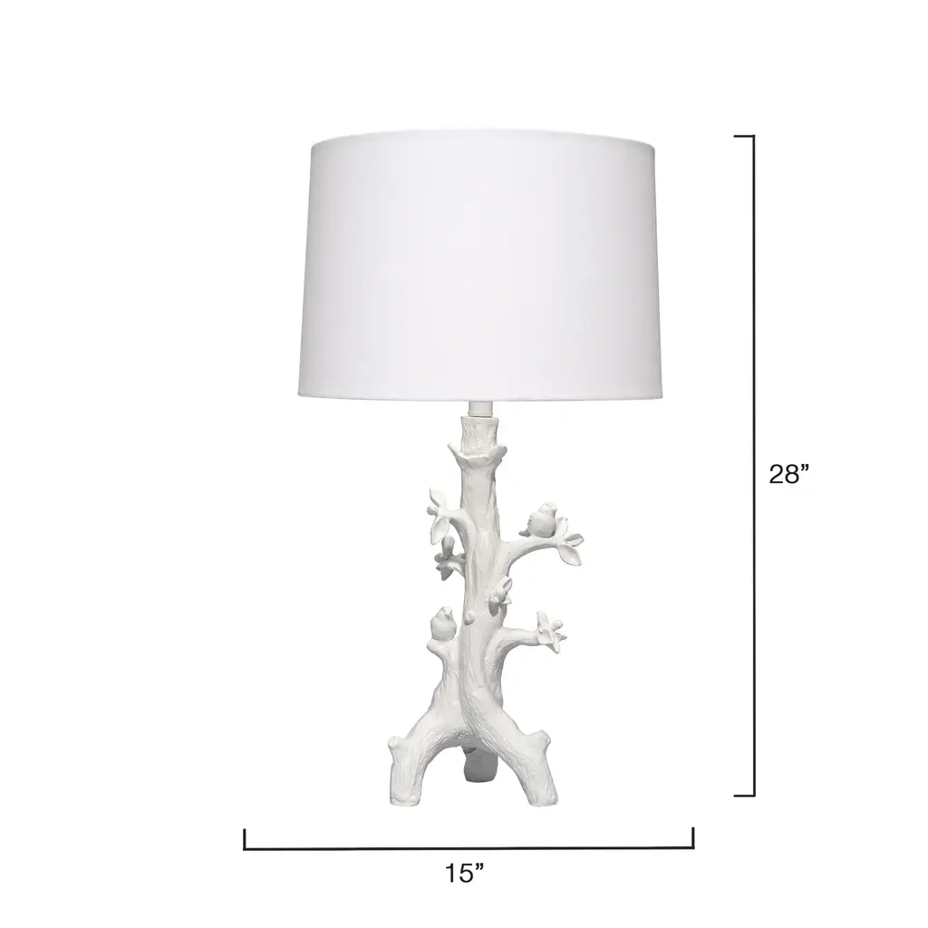 Artisans crafted the trunk-like base of this charming lamp from top-quality resin. Adorned with whimsical songbirds and sprouting leaves, its matte white finish paired with a white linen drum shade creates a clean and inviting look. A delightful bird-shaped finial completes the design. Place one on a side table, add a cozy chair, and you've created the perfect nook for story time. •Handcrafted of Resin•100% White Linen Drum Rolled Edge Shade•Textured Base•Resin Bird Finial in White•7.5" Silver Harp, Silver Spider, Silver NeckThe handcrafted nature of resin creates products with character and individuality. The variations in tone and texture are preserved, to create pieces rich in detail and natural beauty. These unique imperfections and variations are what define our products, with each piece having its own personality. •Lamp Body Dimensions: 16"H x 6"W x 6"D• Shade Dimensions: 10"H x 15"W x 15"D, Top Diameter 14"• 1 (A19)bulb required; Bulb Not Included• 150 Max Wattage; 110 Volts• E26 Bulb Base Type • 8 FT Clear Cord • 3 Way• Protective White Felt• Not Damp Rated We do not recommend using harsh or abrasive cleaners at anytime as they can damage product. Wipe surfaces gently with a soft, dry cloth. If needed, you may use a lightly damp cloth with water only on base.
