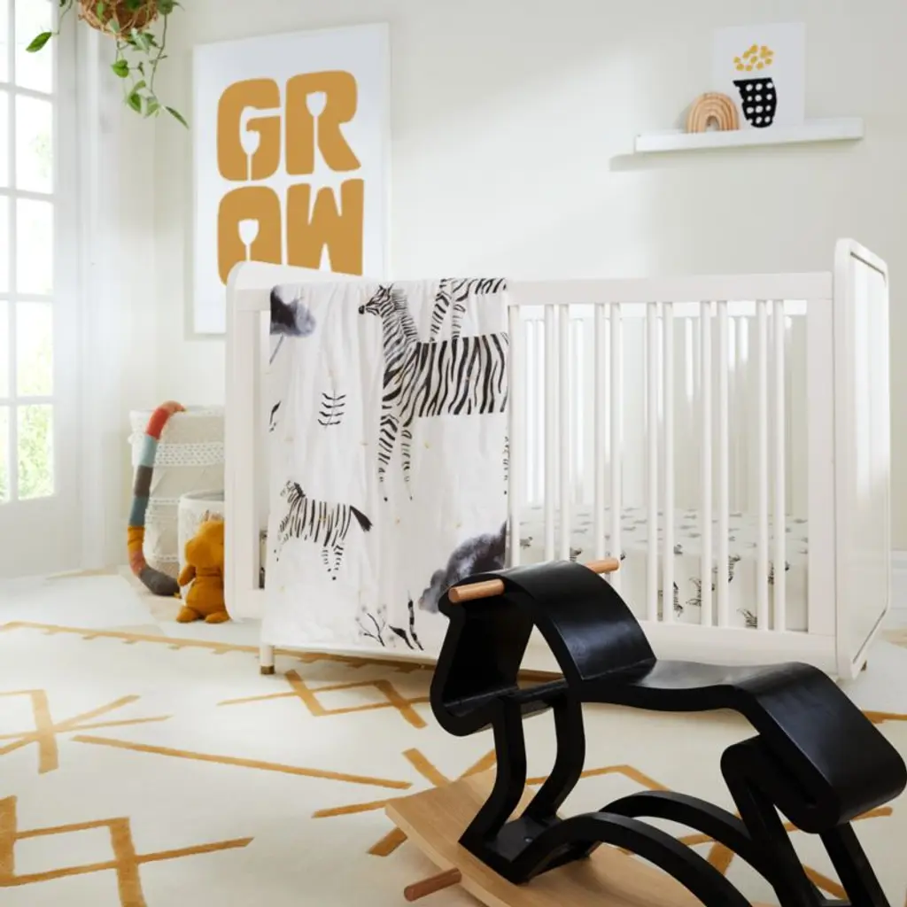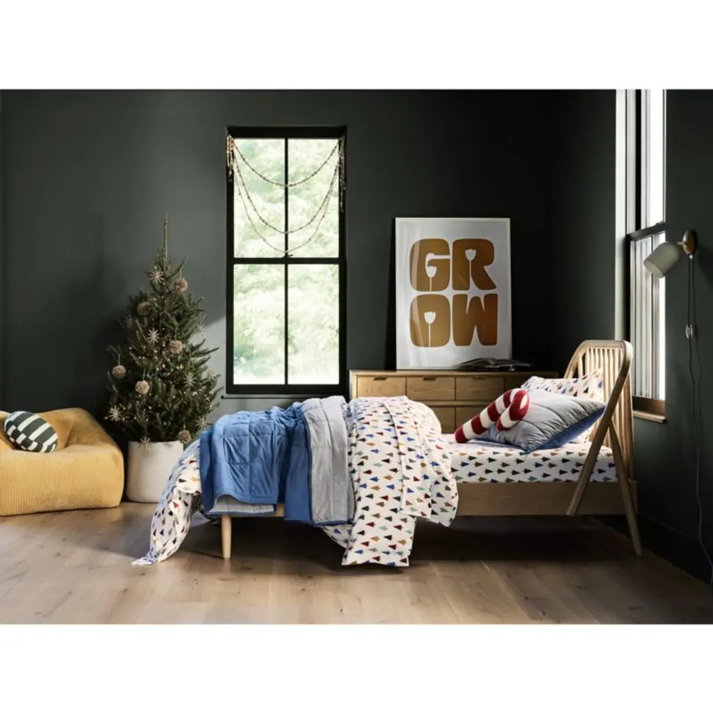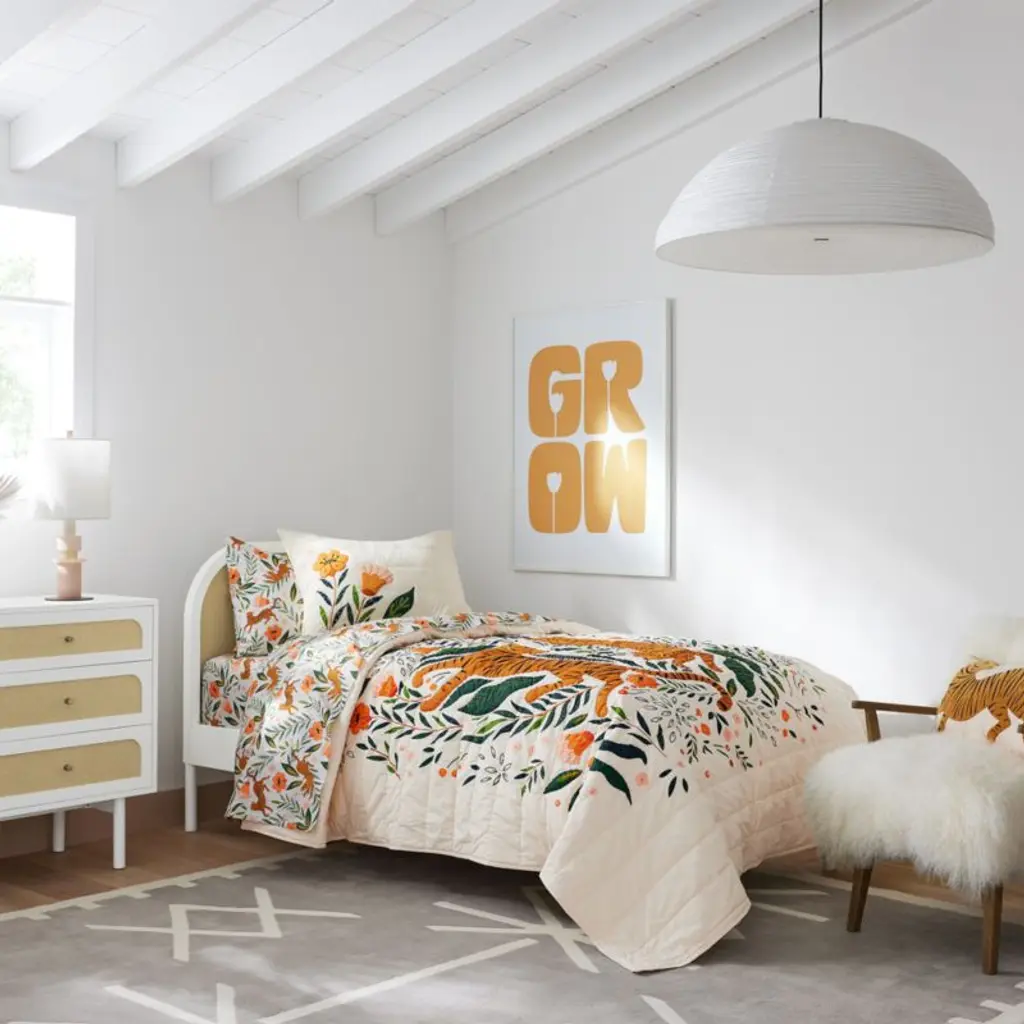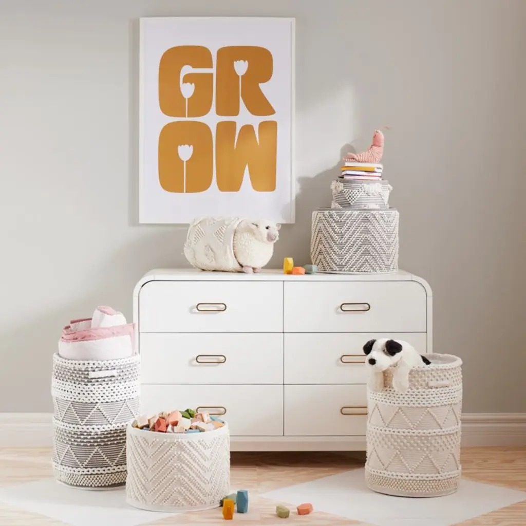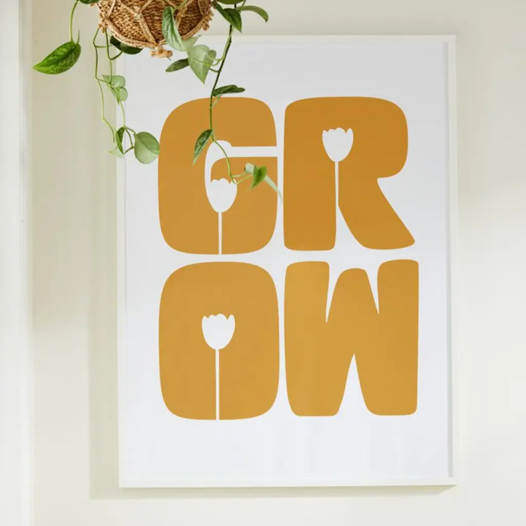 Make room to grow. With a mustard-yellow font that feels decidedly groovy, our framed print spells out G-R-O-W. As a delightful detail, the letter's counters (negative spaces) are made of tiny tulips. This upbeat artwork energizes spaces where little ones sleep, eat, and playor, you know, grow. A Crate & Kids exclusive, this giclee print is displayed under kid-friendly acrylic within a matte white frame.