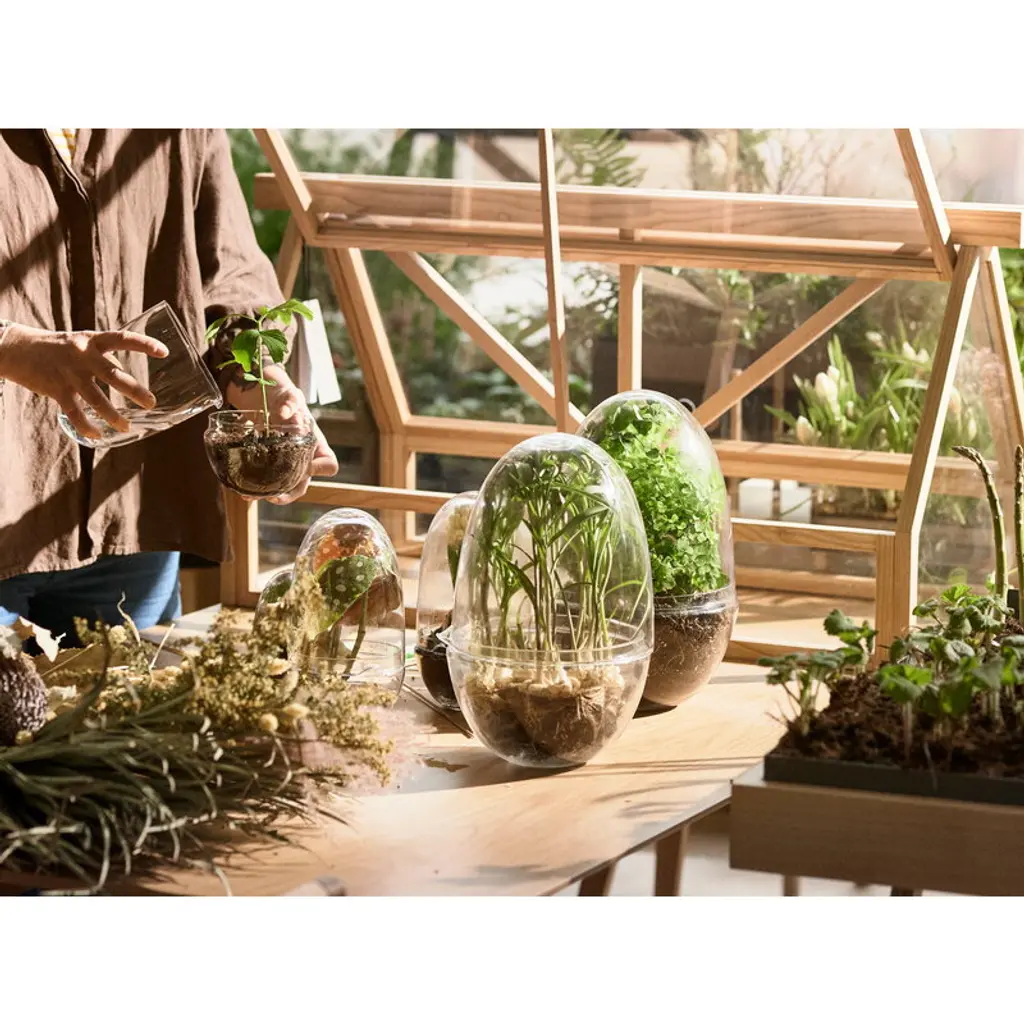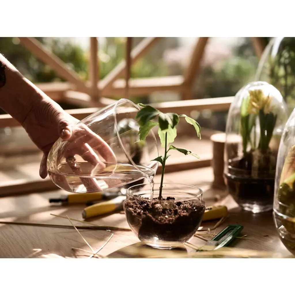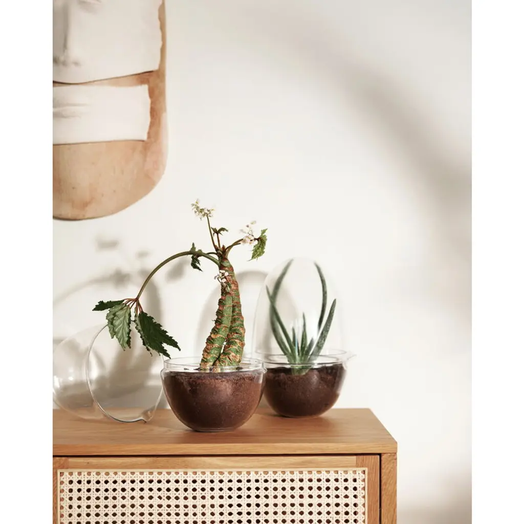 Grow mini greenhouse, designed by Caroline Wetterling for Design House Stockholm, provides an attractive setting for growing small plants and flowers, and it doubles as a beautiful decorative object. Grow mini greenhouse consists of two handmade glass parts: the bottom part is for the soil, and the top has a small spout which makes it suitable for watering the plant. The spout also functions as a valve that regulates the moisture and temperature inside the glass greenhouse.