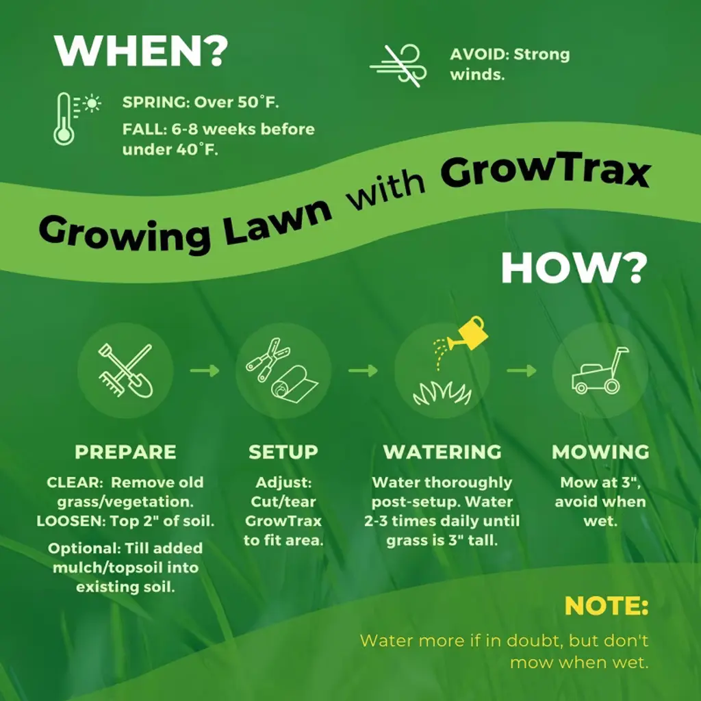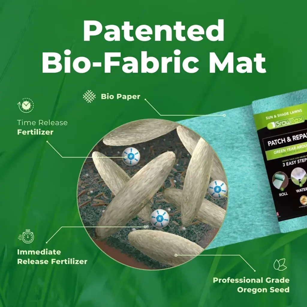 GrowTrax provides an easier, cheaper, better way to grow grass. The grass seed and fertilizer are sandwiched between 2 bio-fabric layers. It literally sticks to the ground when moistened, no staking required, providing excellent seed to soil contact. GrowTrax holds 6X its weight in water. For fast germination and uniform growth, simply roll, water and watch it grow.