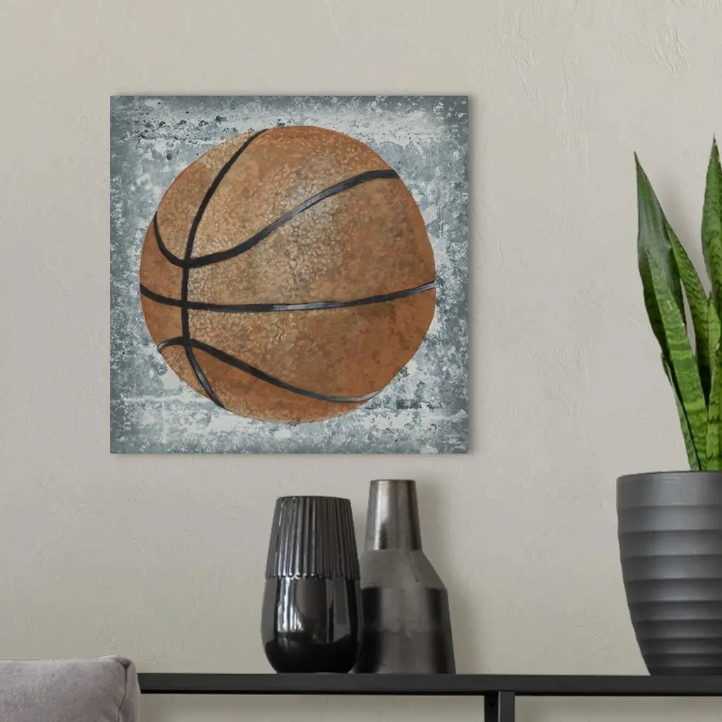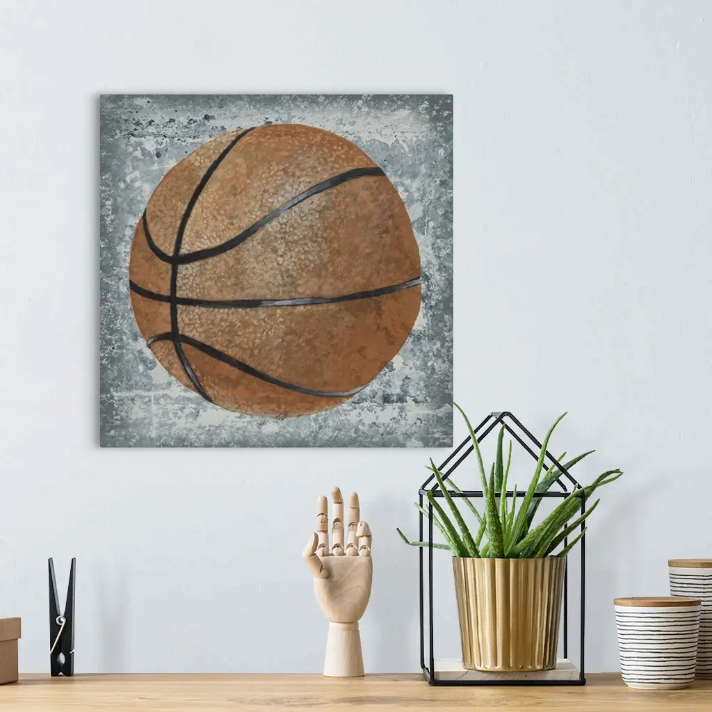 Square sports decor with an illustration of a basketball on a gray and white textured background.
