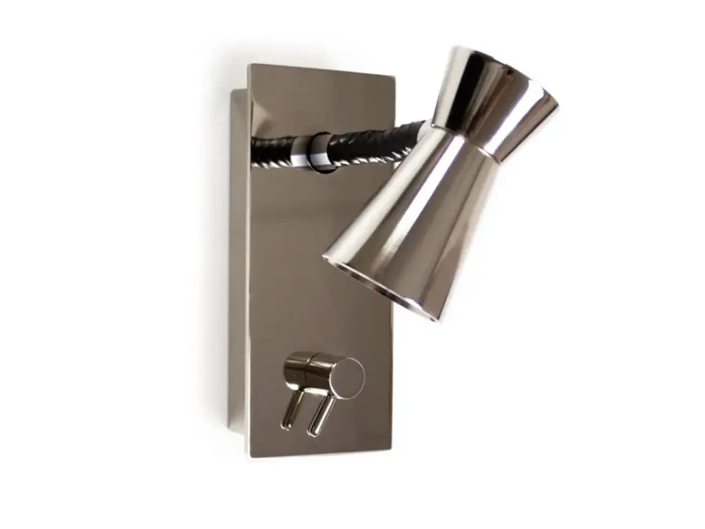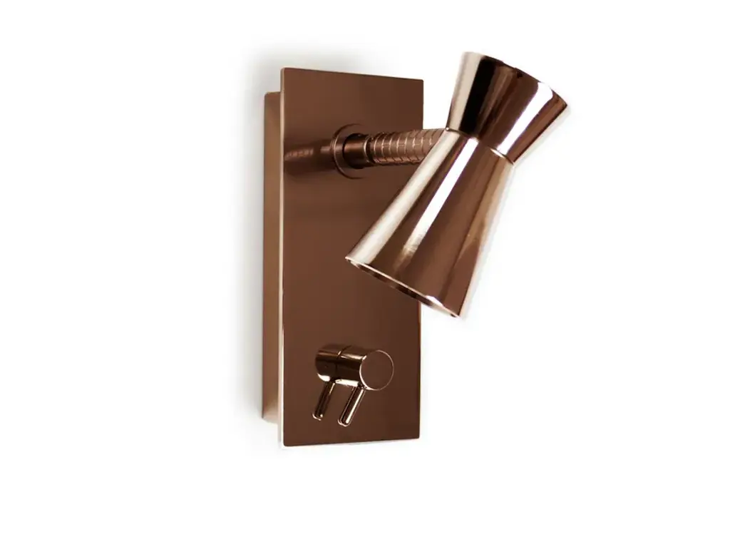 G+T is an Adjustable metal reading lamp.Light source:1 x Custom LED 3 W500 Lm nominal2700 °K; CRI>90IP20G+T is an innovative reading lamp, born from the idea of a portable and luxurious product to meet specific space and installation needs; this makes it suitable for contexts such as yachts and superyachts, historic buildings, or exclusive boutique stores. The head recalls a cocktail jigger (as the name G+T, or gin & tonic, suggests), and the arm is in brass covered with braided leather.Available in the battery version with a magnetic connection, or wall-mounted. The battery-powered model is rechargeable via the USB Type-C port (which in the wired version is used for charging smartphones or tablets). The control (with three intensity levels) is conveniently positioned on the head. The battery-powered version comes with the following accessories: a wall-mounted bracket, a bracket for table fixing, and a leather pocket with counterweight for an armchair/sofa armrest.Now also available in the reading and sospension version.