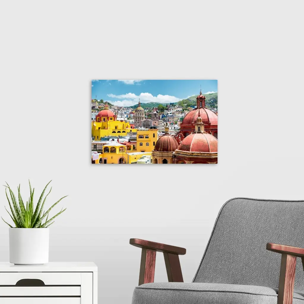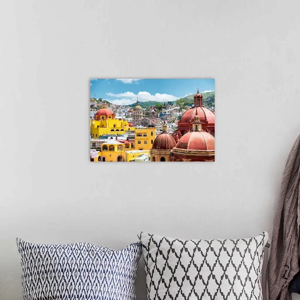 Photograph of a cityscape in Guanajuato, Mexico, highlighting the colorful buildings and church domes. From the Viva Mexico Square Collection.