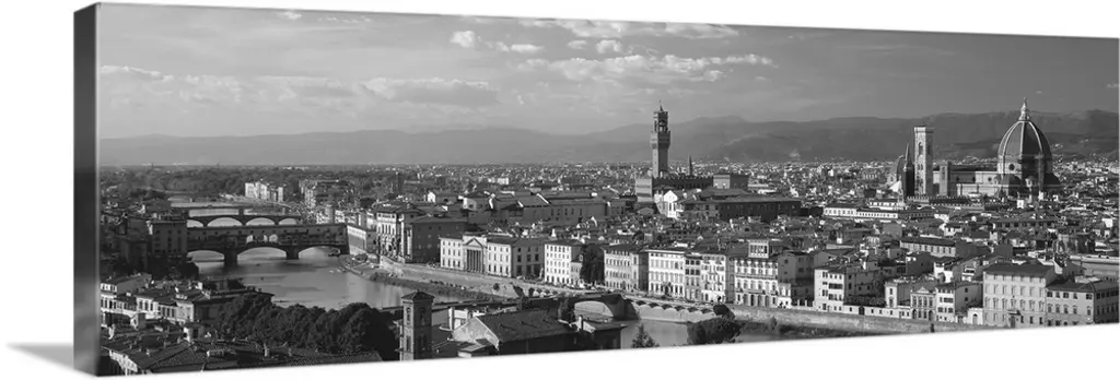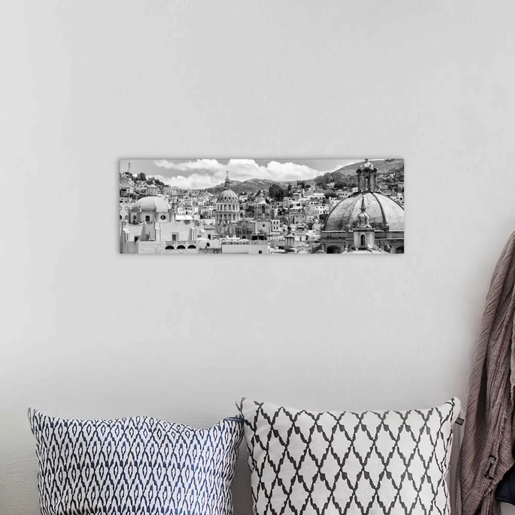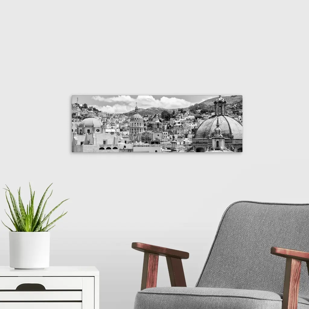 Black and white panoramic photograph of a cityscape in Guanajuato, Mexico. From the Viva Mexico Panoramic Collection.