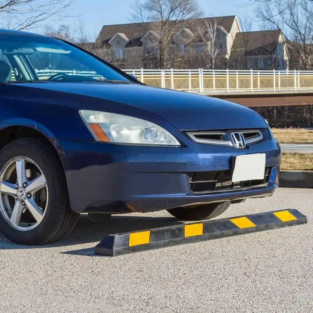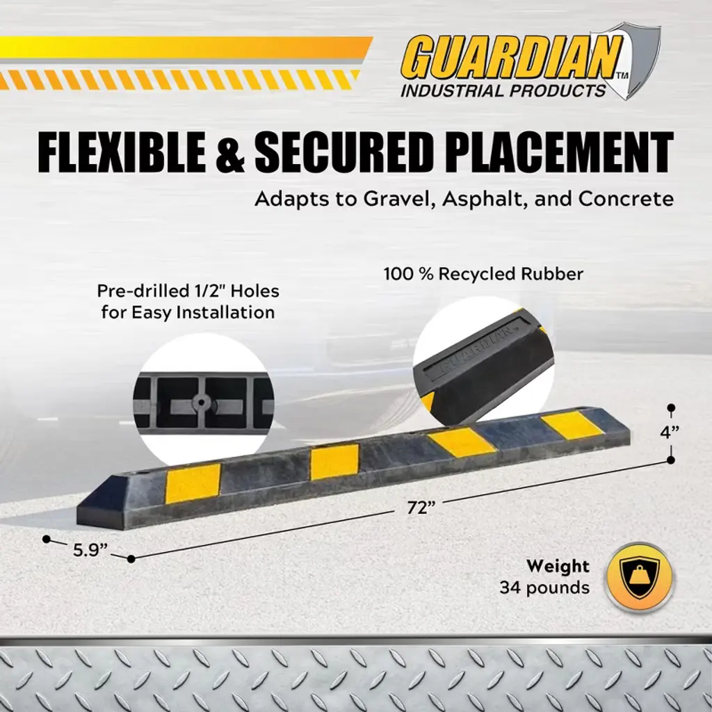Ensure safe and organized parking with the Guardian 6-foot Rubber Parking Curb, designed to prevent vehicles from rolling beyond designated spaces. Whether in garages, parking lots, or driveways, this heavy-duty curb acts as a reliable stop, protecting walls, sidewalks, landscaping, and other vehicles from accidental damage. Built from 100 percent recycled rubber, this parking curb offers superior durability over traditional concrete stops. Unlike concrete, the accessory piece will not chip, crack, or crumble, making it a long-lasting solution for both indoor and outdoor use. The flexible rubber construction conforms to uneven surfaces, including gravel, asphalt, and concrete, ensuring secure placement in any environment. Designed to withstand extreme temperatures, UV light, oil, gas, and moisture, this parking stop is built for year-round use without deteriorating. The bumper features pre-drilled 1/2-inch holes for optional permanent installation (hardware not included), providing added stability when needed. With the parking stop having a high-visibility design, this curb is easy to see even in low-light conditions, enhancing safety in parking areas. Upgrade your parking setup with this reliable, durable piece of equipment that is resistant to weather and is maintenance-free. Use the Parking Stop from Guardian for assistance in parking cars, trucks, buses, and motorcycles.